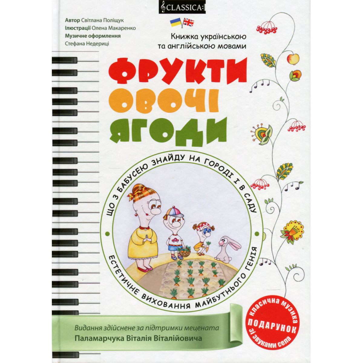 “Ви чули коли-небудь, як звучать овочі та фрукти? Ні? Тоді швидше вирушайте в сад або на місто і прислухайтеся. Он там черв“ячок повзе по яблуку - і чути легкий шелест, а он з помідори скочується краплина роси - і лунає тихе“ кап-кап-кап “... Гортаючи сторінки цієї книги, ви разом з малюком поринете у смачний світ - світ, де можливо все. А якщо раптом ваш Всезнайка не захоче їсти корисні овочі і фрукти, книга теж стане в нагоді, адже про них тут можна дізнатися таке, що відразу стане смачно. Мелодичная і стоголосі музика зі звуками природи перенесе вас туди, де ростуть дари матінки-природи. І ще один сюрприз: у книзі сховалися англійські слова. Знайдіть їх - і дізнаєтеся, як звучать фрукти і овочі на англійській мові. Приємного апетиту, читання, слухання! Увага: в книзі ви знайдете слово-код, з яким можна буде вільно скачати музичний супровід до книги на сайті видавництва. Таким чином, нова дитяча книга від Степана Недериці - це комплект з таким складом: 1. кольорова книга з віршами Світлани Поліщук, в якій назви фруктів-овочів представлені українською та англійською мовами 2. розфарбування Олени Макаренко з зображеннями фруктів-овочів-ягід, наведених в основний книзі 3. можливість безкоштовно завантажити музичний супровід до книги, розроблене Степан Недериця