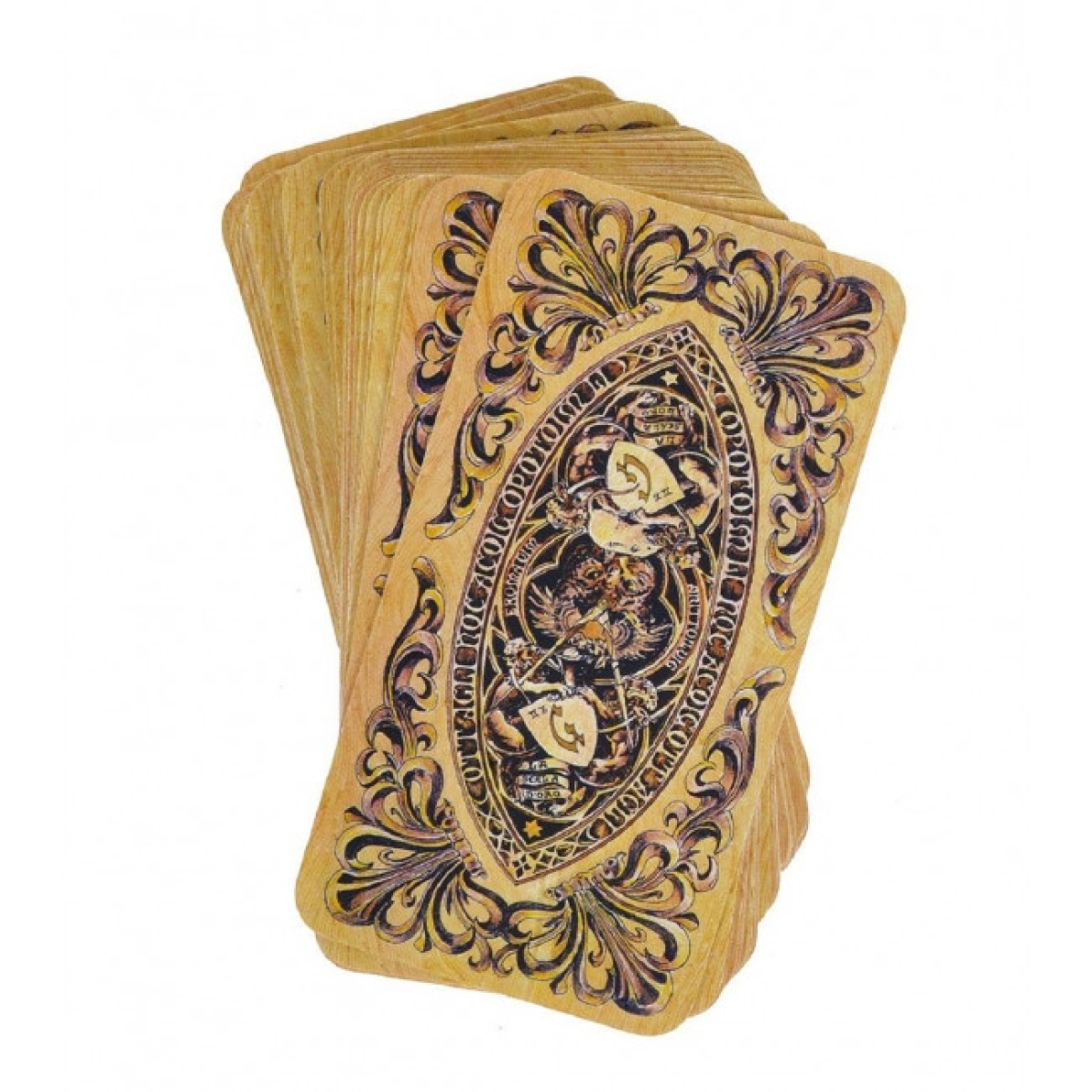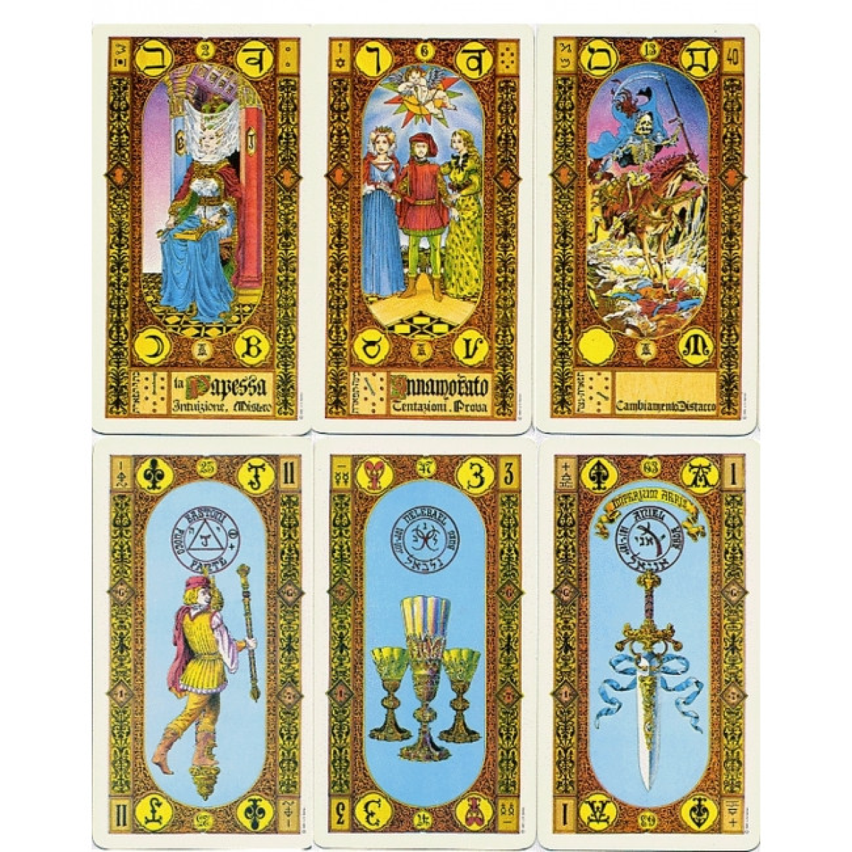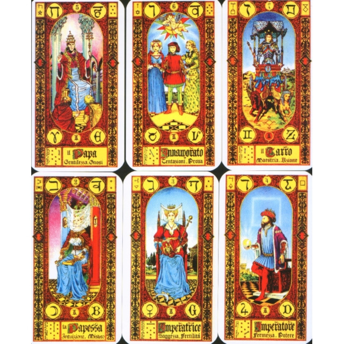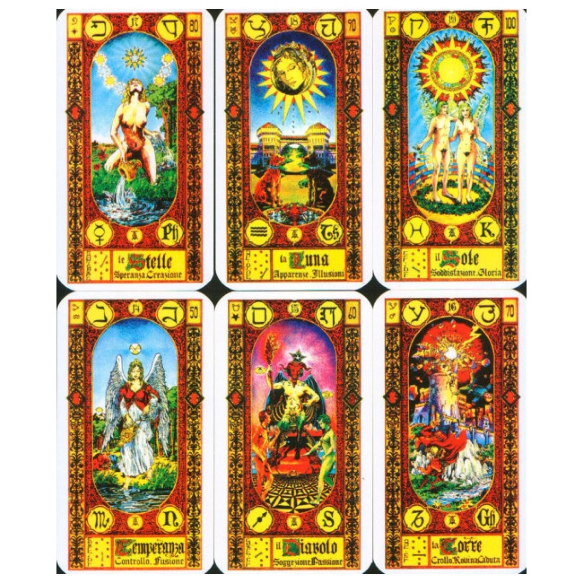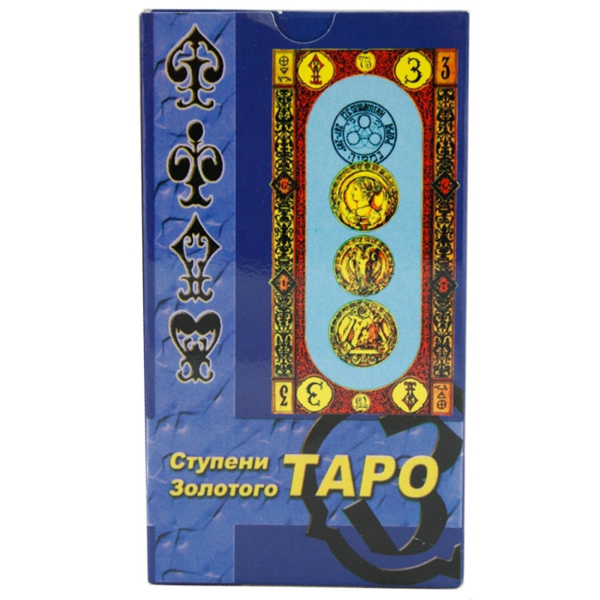 Сходинки Золотого Таро Джорджіо Тавальоне є італійським ілюстратором і вченим езотеричного напрямку. При створенні Ступеней Золотого Таро, він був натхненний цими словами з Paradiso Данте: «Я бачив драбину кольору золота, на якій сяяв промінь сонця, що зійшло настільки високо, що мої очі не могли побачити вершину ...« Він бачить карти таро, як сходинки , що веде від створення / народження вгору до кінцевої реалізації. Карти в цій колоді є багатими символікою і дуже докладні з декоративними межами і цифрами. Кожна карта з Старших арканів має 11 різних символів і ідентифікаторів, включених в її дизайн. Вони показують езотеричні відповідності для кожної карти. Назви і описи на італійській мові. Пам“ятка була переведена на англійську мову і написана власною каліграфією Tavaglione. Колода «Сходинки Золотого Таро» - одна з найвідоміших і заслужено популярних колод Таро. Гліфи Великих арканов повністю відповідають класичної традиції Райдера, Молодші аркани не мають сюжетних картинок - на них зображені символи масті у відповідній кількості. На кожній карті вказані наявні астрологічні, нумерологічні і каббалістичні відповідності даному аркані. Традиція: Папюса Молодші аркани: символи масті Масті: жезли, чаші, мечі, пентаклі (Batoni, Coppe, Spade, Denari) Карти двору: Паж, Лицар, Дама, Король (Fante, Cavaliere, Regina, Re) Нумерація: Шут 0 Сила 11 Правосуддя 8 Категорія: окультна; середньовіччя / ренесанс Виробник: Україна