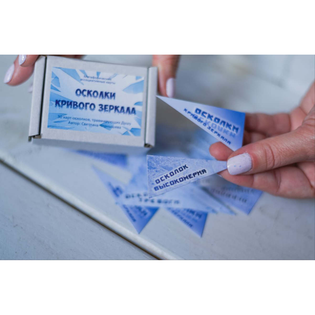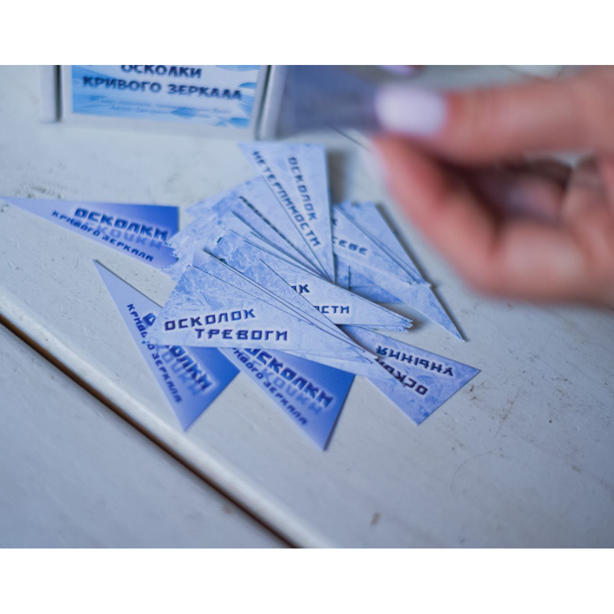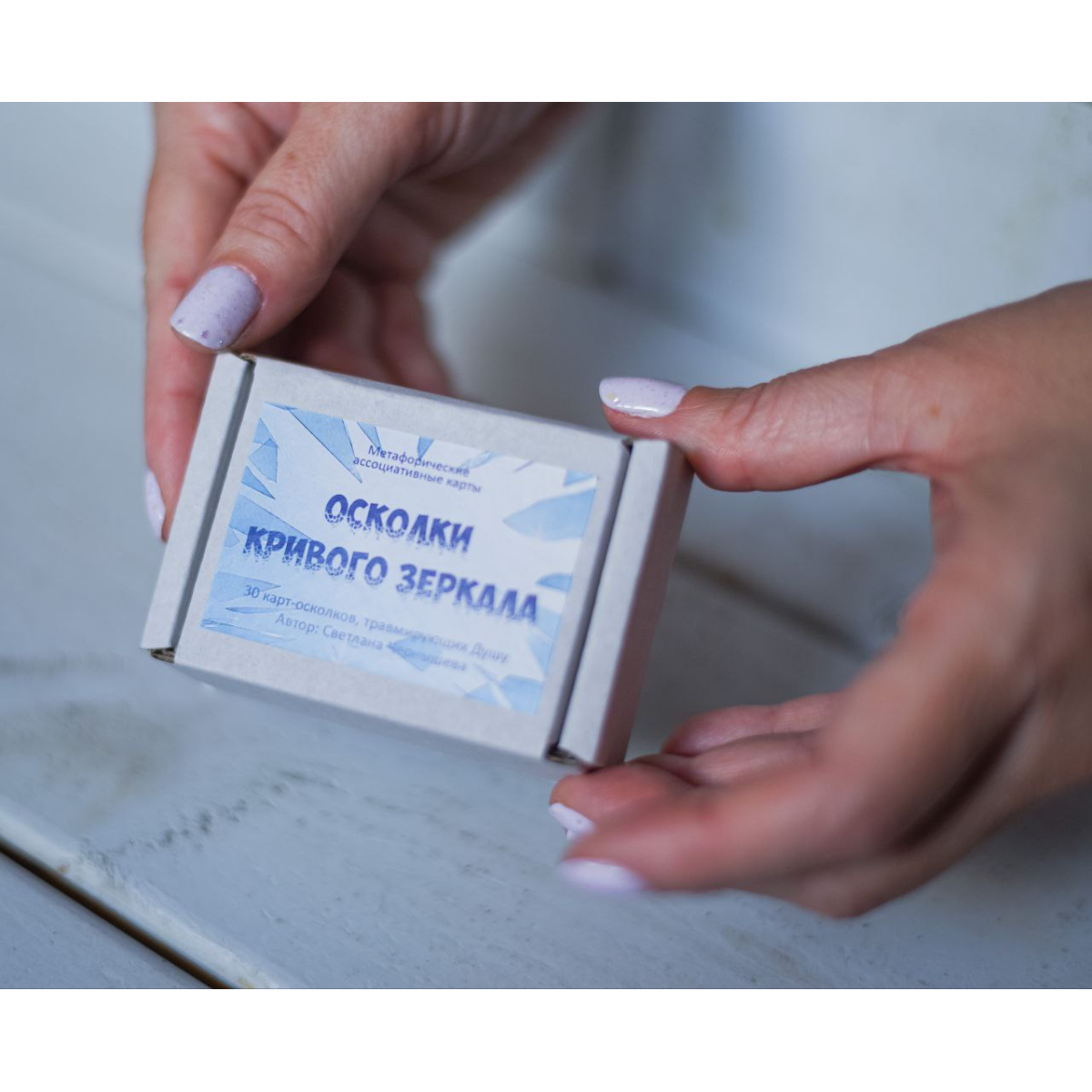 Текстова колода “Уламки Кривого Дзеркала“. Уламки - це те, що ранить і травмує Душу, залишаючи хворобливий слід у Серці. Уламок непрожитого болю, що відправляє Життя і змінює сприйняття реальності - те, що нерідко є першопричиною і тому є ключем до лікування для терапевта. “Мільйони, більйони його уламків наробили, проте, ще більше бід, ніж саме дзеркало. Деякі з них були не більше піщинки; розлітаючись по білому світлу, вони потрапляли, траплялося, людям у вічі і так там і залишалися. Людина ж з таким уламком в оці починав бачити все навиворіт або помічати в кожній речі одні лише погані сторони, - адже кожен уламок зберігав властивість, яким відрізнялося саме дзеркало. Христин Андерсон «Снігова королева» Спочатку колода була частиною МАК “Історія Каю“, але тепер цю текстову колоду можна придбати окремо. Ця маленька колода самодостатня. У колоді є інструкція з описом та двома техніками для роботи. Структура колоди *30 текстових карт-уламків у формі уламків *Інструкція *Коробочка Мова: російська. Класифікація колоди – текстова/універсальна/казкова/спеціальна Травма, подібно до осколка Кривого Дзеркала, спотворює сприйняття дійсності. Травмована людина, забуває про свою силу, про ресурси, якими володіла, про те хороше, що дала йому сім“я. Травма ніби зупиняє час, заморожує Душу і заважає йти вперед та розвиватися. З часом, ми звикаємо і навчаємося жити з нею, поки в якийсь момент якийсь тригер знову не включить її і це хороший привід зцілити її. Можливо, час настав. Ще один цікавий момент, який у цьому розділі важливий - уламки з“явилися задовго до того, як травму було завдано Каю, вони з“явилися навіть задовго до його народження. Причина часто набагато раніше, ніж це може здатися на перший погляд. І ця метафора може також використовуватися при роботі з осколками фахівцями, які працюють із родовими сценаріями, минулими життями тощо. Працюючи з травмою, я неодноразово переконувалася, що коли ми шукаємо перший досвід цього стану, нерідко його можна знайти в ранньому дитинстві. А якщо піти ще далі, то ми побачимо, що цей досвід передавався з покоління до покоління. І поступово можна дійти до початку, до вихідної точки цієї травми, цього шаблону, який передавався через покоління. І колода «Уламки Кривого Дзеркала» може у цьому допомогти. Вона чудово доповнить роботу з іншими МАК. Підійде психотерапевтам, ігропрактикам, МАК-фахівцям, регресологам, казкотерапевтам, травмотерапевтам.