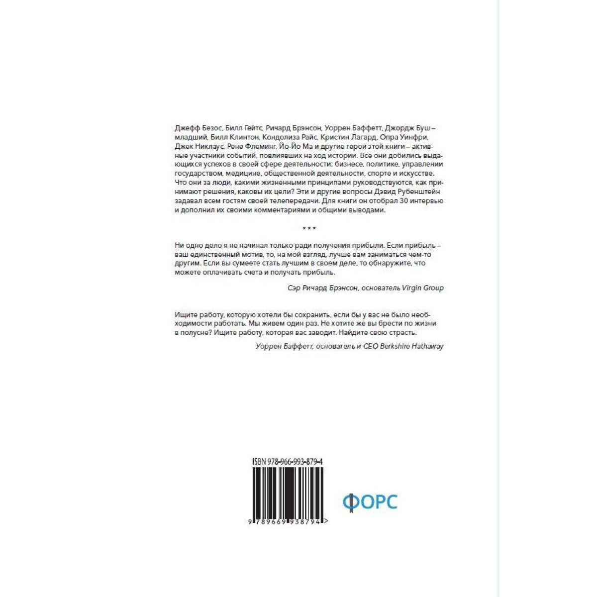 Керівні принципи та філософія Білла Гейтса, Джеффа Безоса, Рут Гінзбург, Уоррена Баффета, Опри Вінфрі та багатьох інших впливових лідерів. Останні п“ять років автор Девід М. Рубінштейн — далекоглядний співзасновник The Carlyle Group і ведучий шоу — розмовляв зі світовими лідерами про те, хто вони і як досягли успіху. Девід перетворив ці відверті бесіди на незамінний посібник для керівників. Книга містить поради та мудрість генеральних директорів, президентів, засновників та провідних виконавців зі світу фінансів (Уоррен Баффет, Джеймі Даймон, Крістін Лагард, Кен Гріффін), технологій (Джефф Безос, Білл Гейтс, Ерік Шмідт, Тім Кук), розваг (Опра Уїнфрі) , Лорн Майклс, Рене Флемінг, Йо-Йо Ма), спорту (Джек Ніклаус, Адам Сільвер, тренер К., Філ Найт), уряду (президент Білл Клінтон, президент Джордж Буш, Рут Гінзбург, Ненсі Пелосі) та багатьох інших сфер. Усередині ви знайдете надихаючі історії про новаторів, ініціаторів змін. Про найкращі рішення Джеффа Безоса, які були прийняті серцем та інтуїцією, а не аналізом. Чому Річард Бренсон ніколи не розпочинає бізнес з метою отримання прибутку. Про Філа Найте, який розглядає Nike як маркетингову компанію, продукт якої є її найважливішим маркетинговим інструментом. Про голову американської військово-промислової корпорації Lockheed Martin Мерілін Х“юсон, яка виросла в будинку без батька з чотирма братами та сестрами в Канзасі, але швидко усвідомила важливість самостійності та цінність долара. Дізнайтеся, як розпочався шлях видатних лідерів і як вони справляються з прийняттям рішень, невдачами, інноваціями, змінами та кризами. Навчайтеся на їх багаторічному досвіді піонерів у своїй галузі. Адже немає двох однакових лідерів.