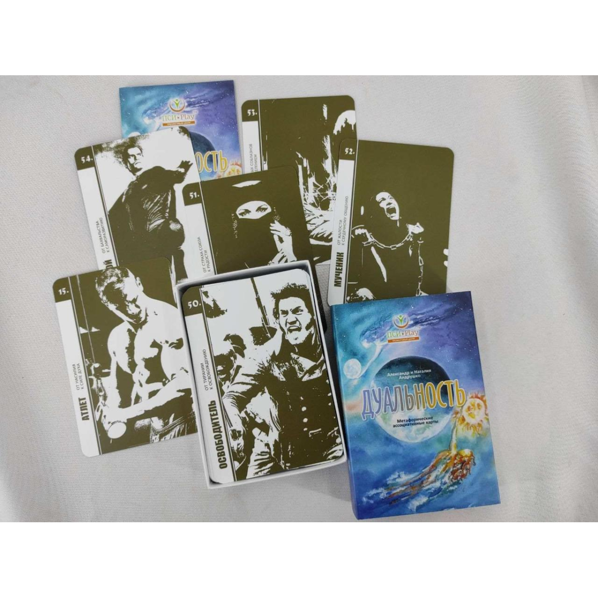 Колода метафоричних асоціативних карток «Дуальність» модифікована на основі роботи Кероллайн Міс «Сакральні договори». У роботі К. Міс описані архетипи та архетипічні образи, виявлені автором під час клінічної роботи з клієнтами. У колоді представлено 56 архетипних образів. Дана колода метафоричних асоціативних карток розроблена спеціально для психологічної трансформаційної настільної гри «Прорив в іншу реальність», так само може використовуватися в роботі з клієнтом окремо від психологічної трансформаційної настільної гри «Прорив в іншу реальність». Архетип - первообраз, оригінал, оригінал, зразок. У аналітичній психології структурний елемент колективного несвідомого. Архетипічний образ - структурний елемент в індивідуальному несвідомому, пов“язаний з архетипом (колективне несвідоме), і виявляється в характерній поведінці та світосприйнятті людини. Колода метафоричних асоціативних карт «Дуальність» відображає скоріше архетипічний образ, ніж сам архетип. Спираючись на працю Кероллайн Міс і теорію Карла Юнга про колективне несвідоме, ми розробили та модифікували (виділили найбільш значуще в образі) структуру колоди. Архетипові образи, представлені в колоді, можна також назвати (умовно звичайно) соціальними ролями, які утримуються в несвідомому особистості людини і виявляються в реальному житті, залежно від обставин. Навіщо людині розрізняти, пізнавати у собі характерні риси архетипового образу? 1. Для корекції патернів деструктивної поведінки. 2. Для трансформації, зміни переконань, що згубно впливають на життя людини. 3. Для виявлення внутрішніх ресурсів, розвитку їх, та формування внутрішніх опор. 4. Для формування та/або зміцнення моральних цінностей.