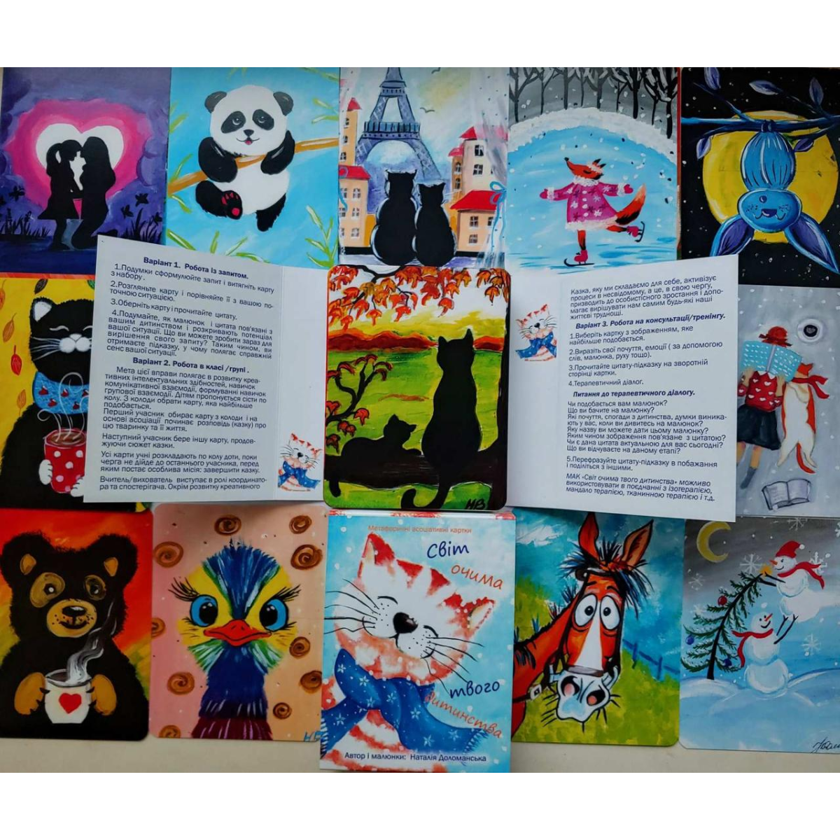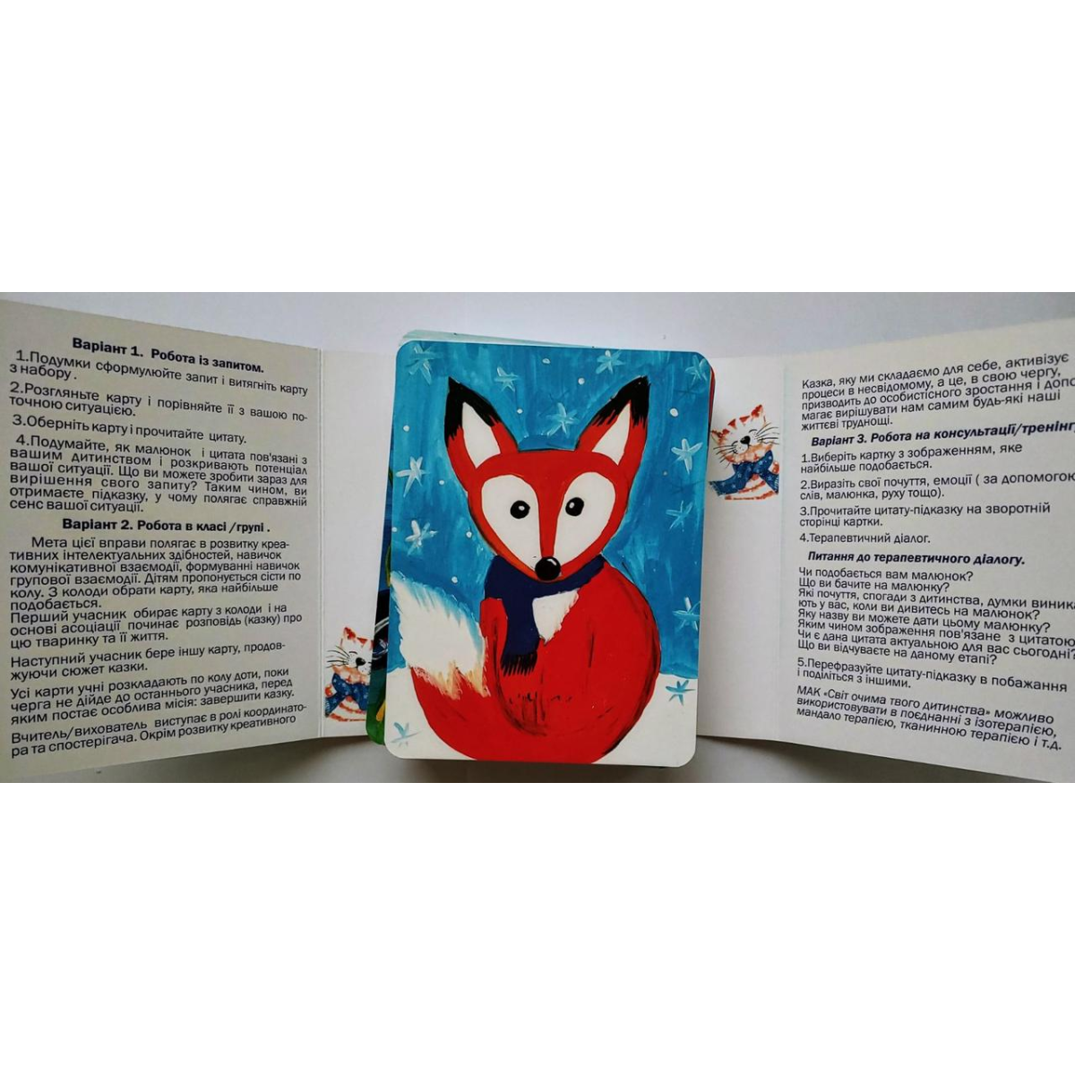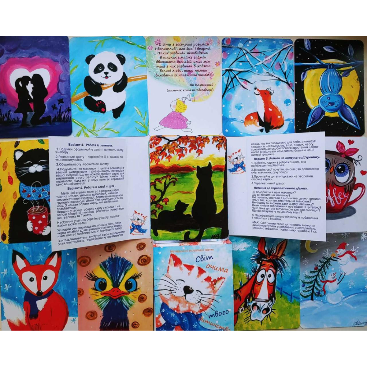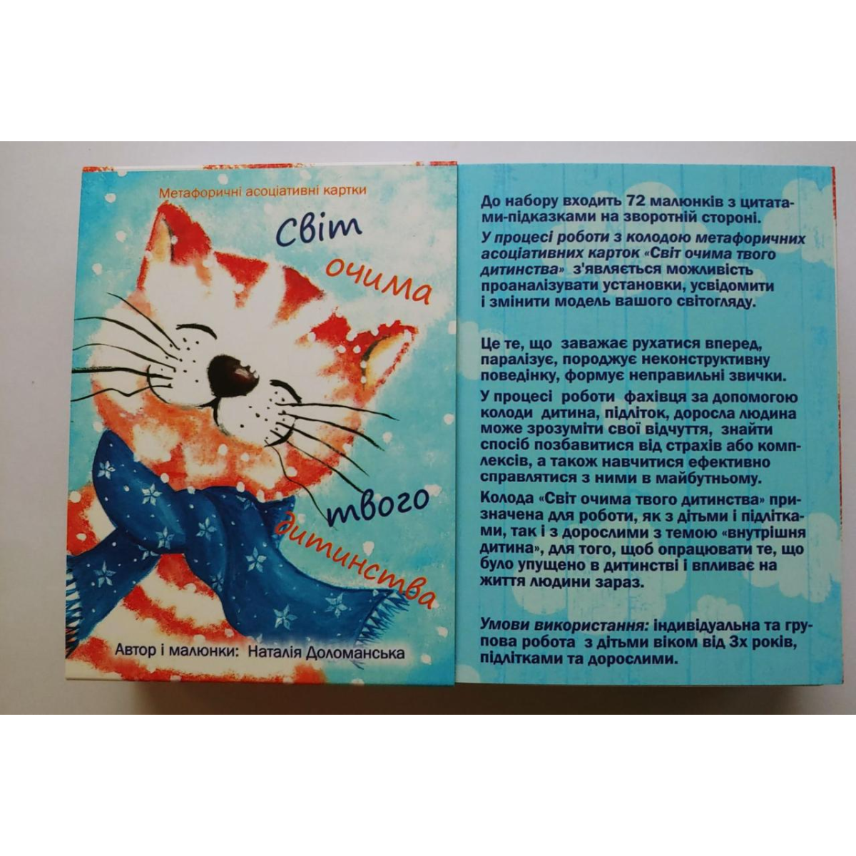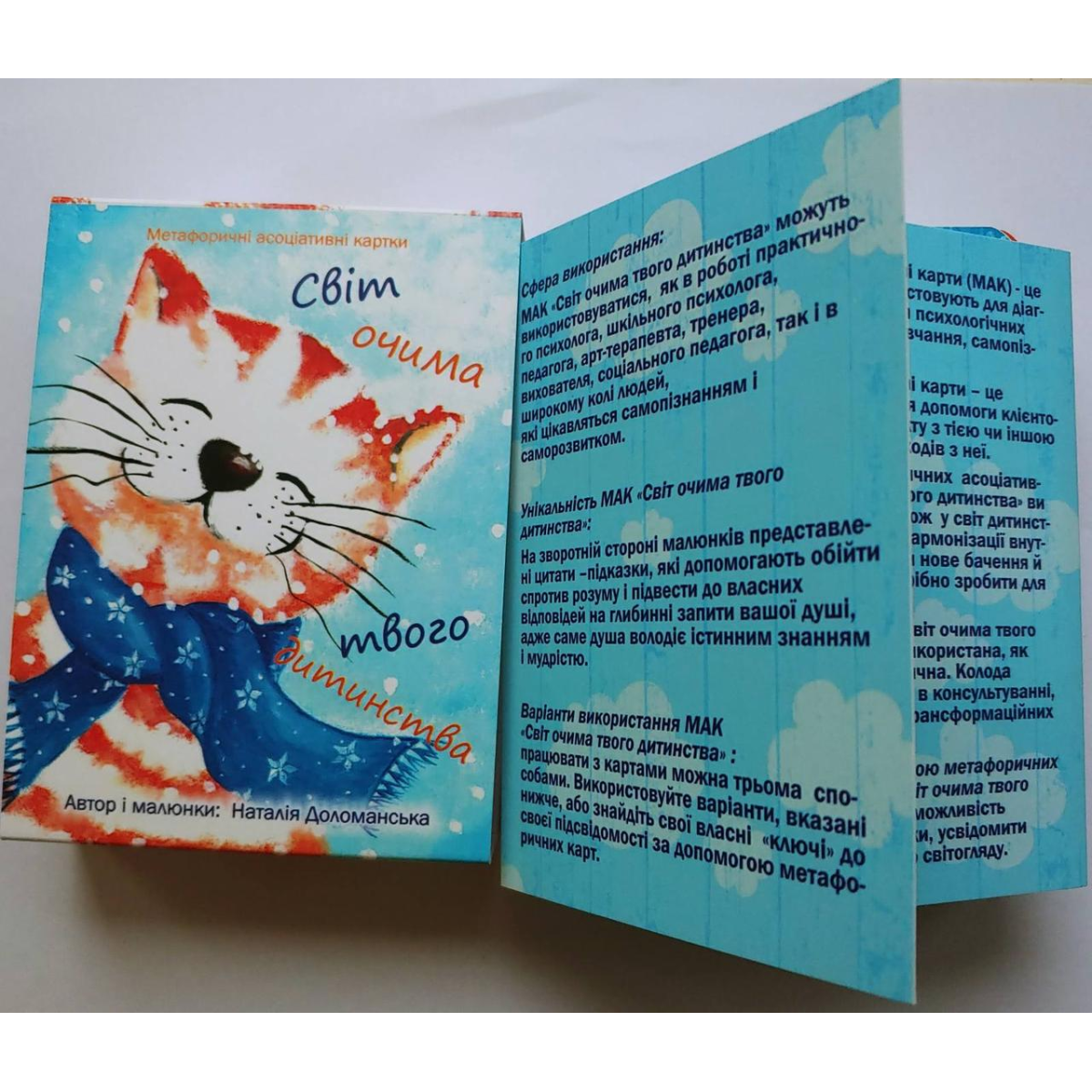 Метафоричні асоціативні карти (МАК) – це набір карток, як використовують для діагностики та опрацювання психологічних проблем, а також навчання, самопізнання, ігор та творчості. Метафоричні асоціативні карти – це інструмент арттерапії для допомоги клієнтові у налагодженні контактів з тією чи іншою ситуацією та пошуків виходу з неї. За допомогою метафоричних асоціативних карт «Світ очима твого дитинства» ви можете здійснити подорож у світ дитинства та подолати шлях до гармонізації внутрішньої дитини, відкрити нове бачення й усвідомити, що вам потрібно зробити для вашої трансформації. Ресурсна колода МАК «Світ очима твого дитинства» може бути використана, як терапевтична та діагностична. Колода прояснює та допомагає в консультуванні , терапії та психологічних трансформаційних іграх. До набору входять 72 карти з малюнками та цитатами-підказками на зворотньому боці. У процесі роботи з колодою метафоричних асоціативних карток «Світ очима твого дитинства» з’являеться можливість проаналізувати установки, усвідомити та змінити модель вашого світогляду, позбутися всього, що заважає рухатися вперед, породжує неконструктивну поведінку, формує деструктивні звички. У процесі роботи фахівця за допомогою колоди дитина, підліток або доросла людина може зрозуміти свої відчуття, знайти шлях позбавлення від страхів або комплексів, а також навчитися ефективно справлятися з ним в майбутньому. Колода «Світ очима твого дитинства» призначена для роботи, як з дітьми та підлітками, так і з дорослими за темою «внутрішня дитина», для того, щоб опрацювати те, що було втрачено в дитинстві та впливає на життя людини в дорослому віці. Умови використання: індивідуальна та групова робота з дітьми віком від 3-х років, підлітками та дорослими. Сфера використання: МАК «Світ очима твого дитинства» можуть використовуватися, як в роботі психолога, шкільного психолога, педагога, арт-терапевта, тренера, вихователя, соціального педагога, так і в широкому колі людей, які цікавляться самопізнанням та саморозвитком. Унікальність МАК «Світ очима твого дитинства»: На зворотному боці малюнків представлені цитати – підказки, які допомагають оминути спротив розуму та підвести до власних відповідей на глибинні запити вашої душі, адже саме душа володіє істинним знанням та мудрістю.