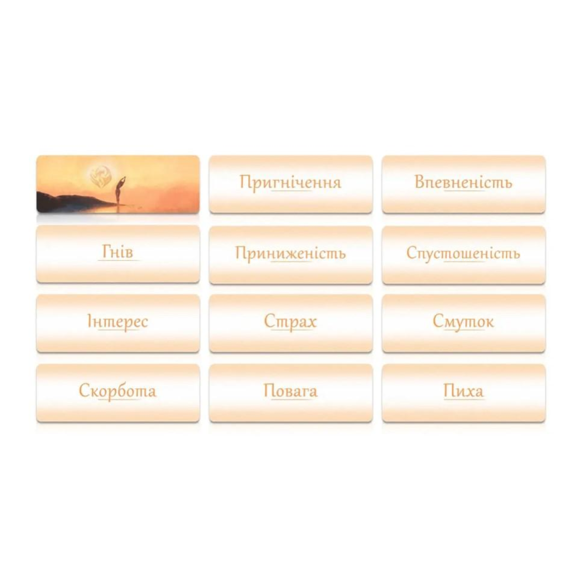 Набір складається з 2-х колод: “Зображення“ та “Слова“;Загальна кількість карток у наборі – 120 шт.: колода “Зображення” – 60 шт., колода “Слова” – 60 шт.;Матова ламінація. |