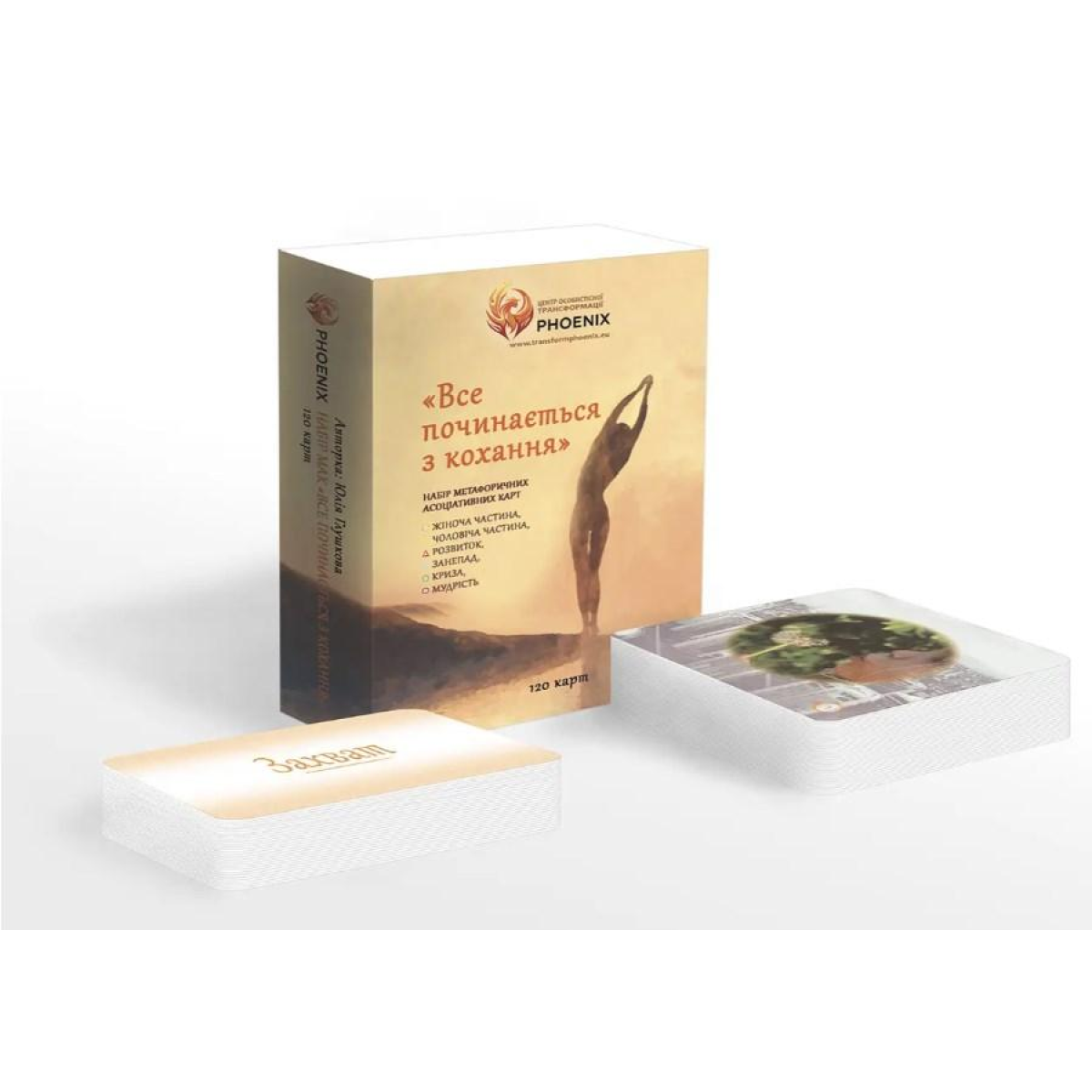 Цей набір МАК – «Все починається з кохання», побудований за принципом протилежностей: персони та тіні. Як день не може існувати без ночі, так і людина створена з полярностей. Людина із задоволенням виявляє себе у суспільстві через соціальні ролі – персону. І таких ролей у нас багато. Є ще одна важлива частина особистості – це «Тінь». Що це таке? Це частина психічного в людині, яку він боїться, уникає, не бажає показувати соціуму. Багато сил йде на те, щоб утримувати увагу та контроль над цією частиною. * А що станеться, якщо людина відмовиться від страху і виявить свою тіньову частину? Що може статися, коли людина скаже: Я такий, який є? Можливо, вона * дізнається і прийме себе такою, якою вона є! * отримає свободу бути собою! * дозволить собі йти за своєю мрією! * її життя зміниться на краще! * Як побачити свої частини психіки? * Як розібратися зі своїми страхами? * Як зрозуміти свої мрії та подарувати собі свободу реалізувати свої ідеї? У цьому наборі авторка постаралася об“єднати свої знання та вклала різні системи та методи, які доповнюють один одного та допомагають у самопізнанні та особистісному розвитку. У наборі Ви знайдете значення карток: * системі чакр, * нумерології, * Різним формам, * кольорам та фігурам зображень, які використовуються у наборі та становлять цілісну картину для ефективної роботи навіть у використанні «нефахівцями». Набір МАК «Все починається з кохання» складається з 2 частин: 60 шт. зображень та 60 шт. слів. Колода із зображеннями створена за 6 принципами: *жіноча частина, *чоловіча частина, *розвиток, *занепад, *криза, *мудрість. Кожна карта складається з двох образів – центрального та фону. Ви чи Ваші клієнти «читають» карту так, як бачать, виділяючи той образ, який їм здається найважливішим. При докладному розгляді картки клієнт робить опис та висновок самостійно. Ваша допомога полягає в тому, щоб ставити вірні прості питання у контексті запиту клієнта на роботу з МАК. Друга частина набору - слова, що відображають почуття, емоції або стану. Ця частина набору також використовують у роботі з вправами виявлення емоційного стану клієнта. Цей набір призначений для вирішення широкого кола завдань, таких як: * Самопізнання, * Особистий розвиток, * Постановка цілей та коучинг, * Робота зі страхами, травматичними подіями, * Особисті кордони, * Вторинні вигоди, * Переконання, * Шукати та знаходити ресурси та багато іншого. Набір «Все починається з кохання» призначений для особистого використання, а також фахівців, які працюють з МАК, психологів, психотерапевтів, коучів, фахівців з персоналу, вчителів, соціальних працівників та всіх спеціалістів допоміжних професій. Автор набору МАК «Все починається з кохання» - Юлія Глушкова: фахівець з роботи з метафоричними асоціативними картами, системний розстановник, фахівець з метапсихології, ігропрактик і спеціаліст, який практикує усвідомлені сновидіння. Кожен, хто придбає набір, має унікальну можливість: онлайн консультація з автором набору з метою уточнення механіки роботи з даним інструментом.