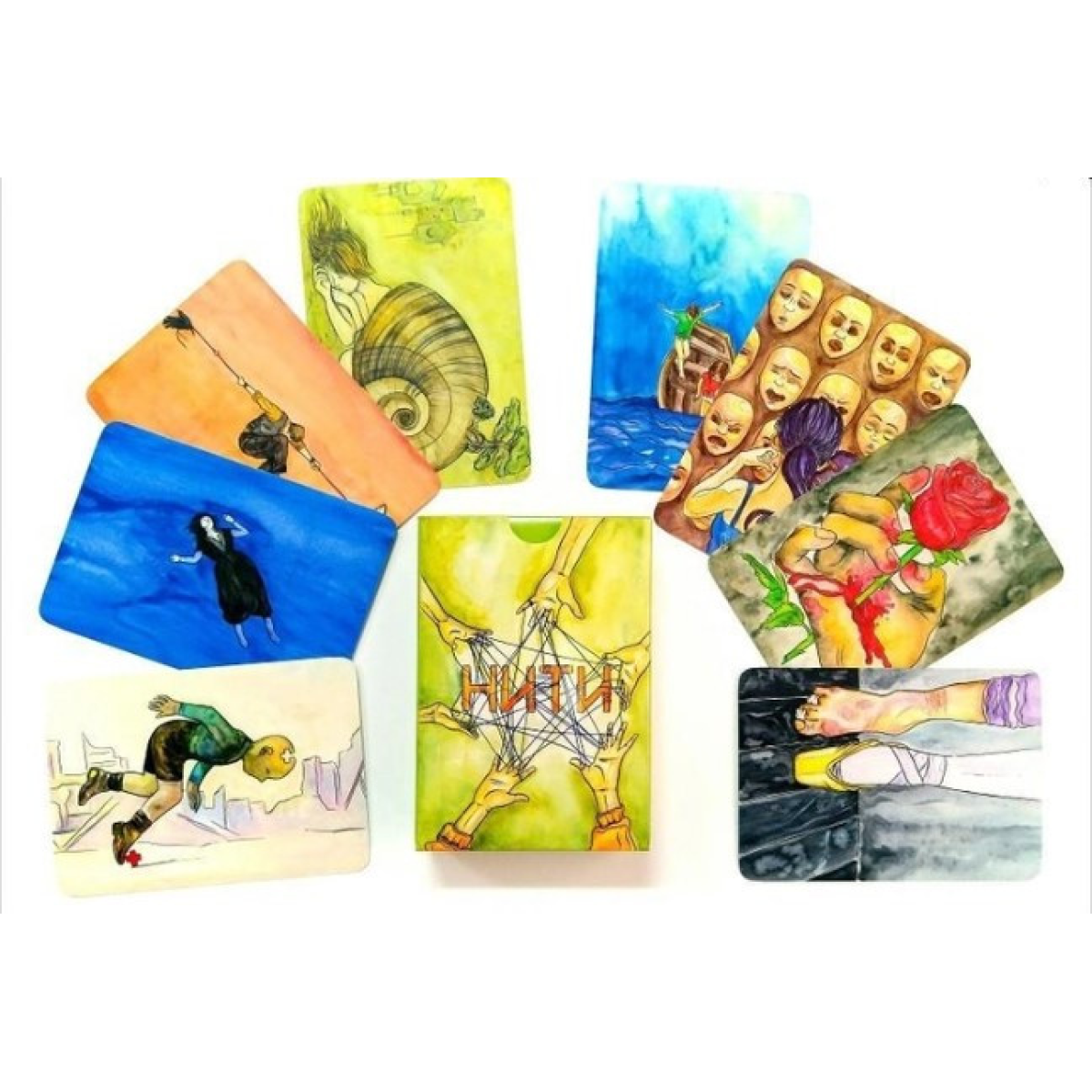 Метафоричні карти «Нітки» призначені для діагностичної та психотерапевтичної роботи з важкими емоційними станами, складним комплексом почуттів, з переживаннями, які важко диференціювати, усвідомити та висловити. Зображення в колоду підбиралися таким чином, щоб вони могли викликати клієнта максимально сильний емоційний відгук. Яскраві та виразні образи карт покликані, минаючи звичні психологічні захисту, допомогти відреагувати пригнічені почуття (в т. ч. багаторічні та «давно забуті») та асимілювати витіснений емоційний досвід. МАК «Нітки» створені для роботи з клієнтами, які: - переживають емоційно важку життєву ситуацію; — перебувають у ситуації важливого та/або ускладненого вибору; - мають особисті порушення (в т. ч. обумовлені травмами), ПТСР, психосоматичні прояви; — перебувають у токсичних та деструктивних відносинах. Метафоричні карти «НІТІ» показані для психодіагностики та психокорекційної роботи з підлітками (від 14 років) та дорослими; для індивідуальної та групової терапії. Карти рекомендовані до роботи клінічних психологів, психологів-консультантів, психотерапевтів, сімейних та МАК-терапевтів. Колода «Нітки» може бути особливо корисною для фахівців, які практикують психодинамічний, екзистенційний, транзакційний, системний підходи. Також карти можуть використовуватися в терапії травми та ПТСР. МАК «Нітки» застосовуються для роботи з наступними клієнтськими випадками: - Різного роду залежності (в т. ч. співзалежність і контрзалежність); - Депресії (в т. ч. масковані); - Прикордонні стани; - Суїцидальні тенденції; - Криза ідентичності; - Нормативні вікові кризи; - Олекситимія; - Горе, втрата; — екзистенційні кризи та безвиході (самотність, самовизначення, тема смерті, питання сенсу життя); - особистісні розлади; - Тривожність; - Токсичні та деструктивні відносини. Колода дозволяє вибудовувати цілісну психотерапевтичну сесію та у її процесі вирішувати такі завдання: 1) усвідомлення та відреагування пригнічених почуттів та витіснених переживань; емоційне проживання; 2) переосмислення ситуації та ролі клієнта в ній; 3) асиміляція емоційного досвіду, усвідомлення його сенсу та значення, прийняття ситуації; 4) пошук та здобуття внутрішніх опор та ресурсів. МАК «Нітки» протягом року проходили апробацію у практичних психологів. Їхні відгуки підтвердили практичну цінність колоди та результативність її застосування. Однак, як зазначила більшість опитаних, цей інструмент вимагає від фахівця уважності, психологічної стійкості та високого рівня компетенції.
