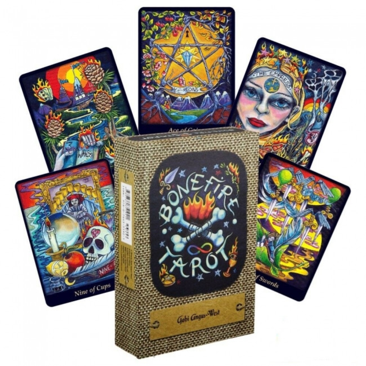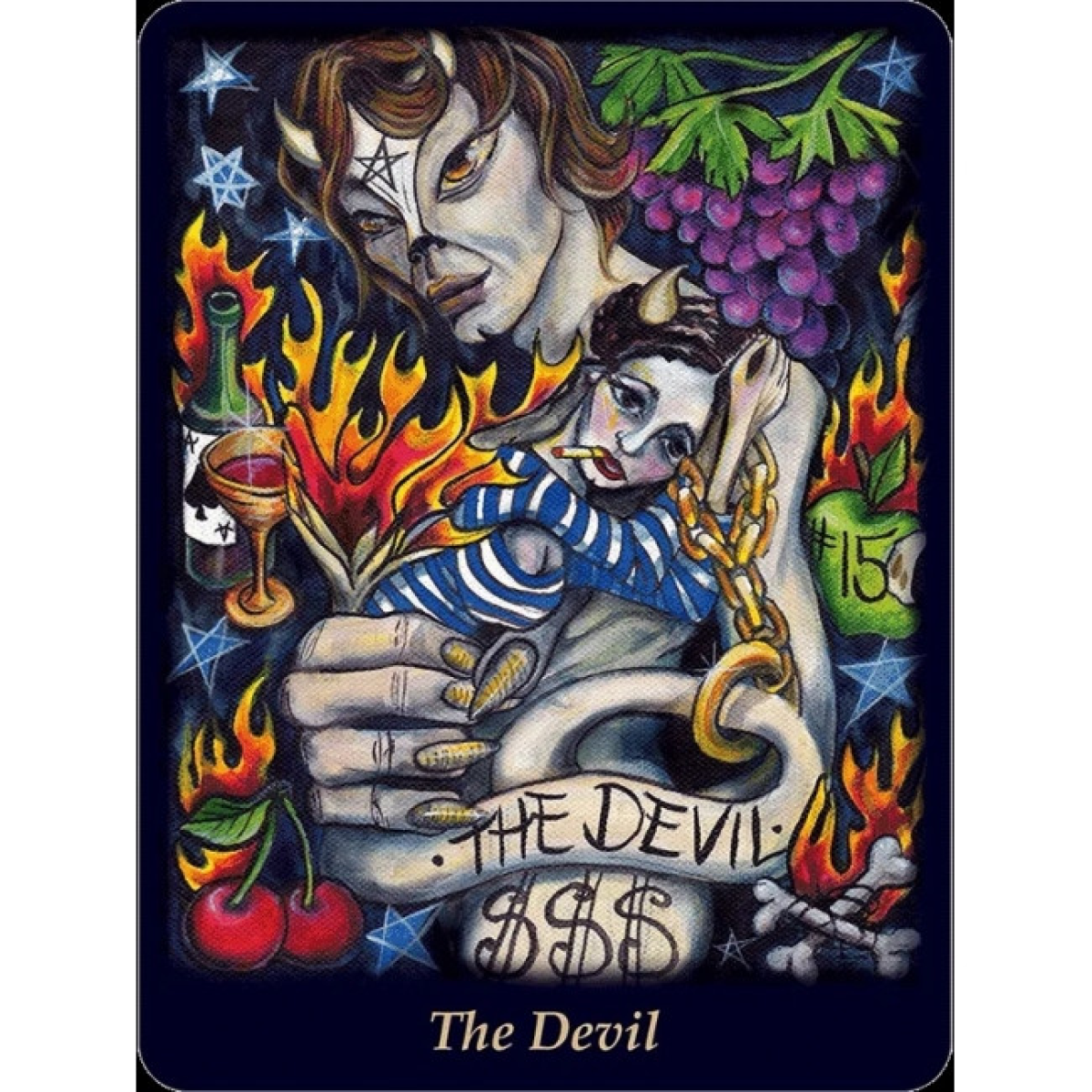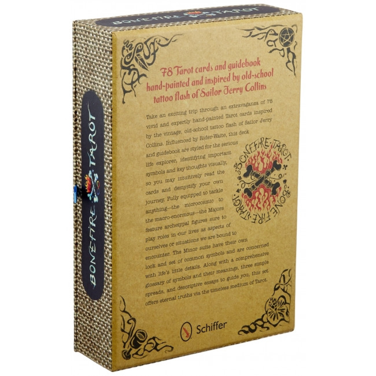 Почніть захоплюючу подорож через феєрію 78 яскравих та вручну намальованих карт Таро, натхнених старовинною, вищою школою татуювання Sailor Jerry Collins. Створена під впливом таро Райдер-Уейт, ця колода та книга-путівник стилізовані для серйозного дослідника життя, що візуально визначає важливі символи та ключові думки, так що ви можете інтуїтивно читати карти та демістифікувати свій власний шлях. Естетично це не приглушена колода. Шанувальники тату будуть раді відзначити, що карти виконані у темно-синьому та яскравих кольорах. Дизайн карт такий же сміливий, з акцентом на звивисті завитки та полум“я. Зображення вискакують із темно-синього фону, і підпис художника – схрещені кістки у вогні – є на кожній карті. У цій колоді не бракує візуальної інтенсивності. І придворним картам, і старшим та молодшим арканам приділяється однакова увага. Хоча всі людські обличчя мають той самий характерний стиль, вони показують емоції, відповідні їх значенням карт. Вузькі темні межі переходять у самі зображення, залишаючи достатньо місця для заголовків унизу. Сорочки карт чорно-білі, із зображенням кістяного вогню в центрі та символами масті у кожному кутку. Таро Вогняних Кістей зберігає назви карт Райдера-Вейта, за винятком Пентаклі, які стали Монетами. Зображення Рірдера-Вейта також можна розрізнити по всій колоді, але дизайнер вніс у них включення та інновації, яких занадто багато, щоб перерахувати. Наприклад, масть Жезлів, Жезли перетворилися на соснові шишки. У «Дев“ятці кубків» ми бачимо добре одягненого, задоволеного чоловіка Уейта-Сміта зі схрещеними руками, з боків якого стоїть низка чашок. Але тут зображення укладено у хитромудру рамку за колекцією предметів на передньому плані: свічка, кришталева куля, перо та пляшечка з чорнилом, яблуко, лимон, череп та пісочний годинник – все, що пливе морем з фоном.