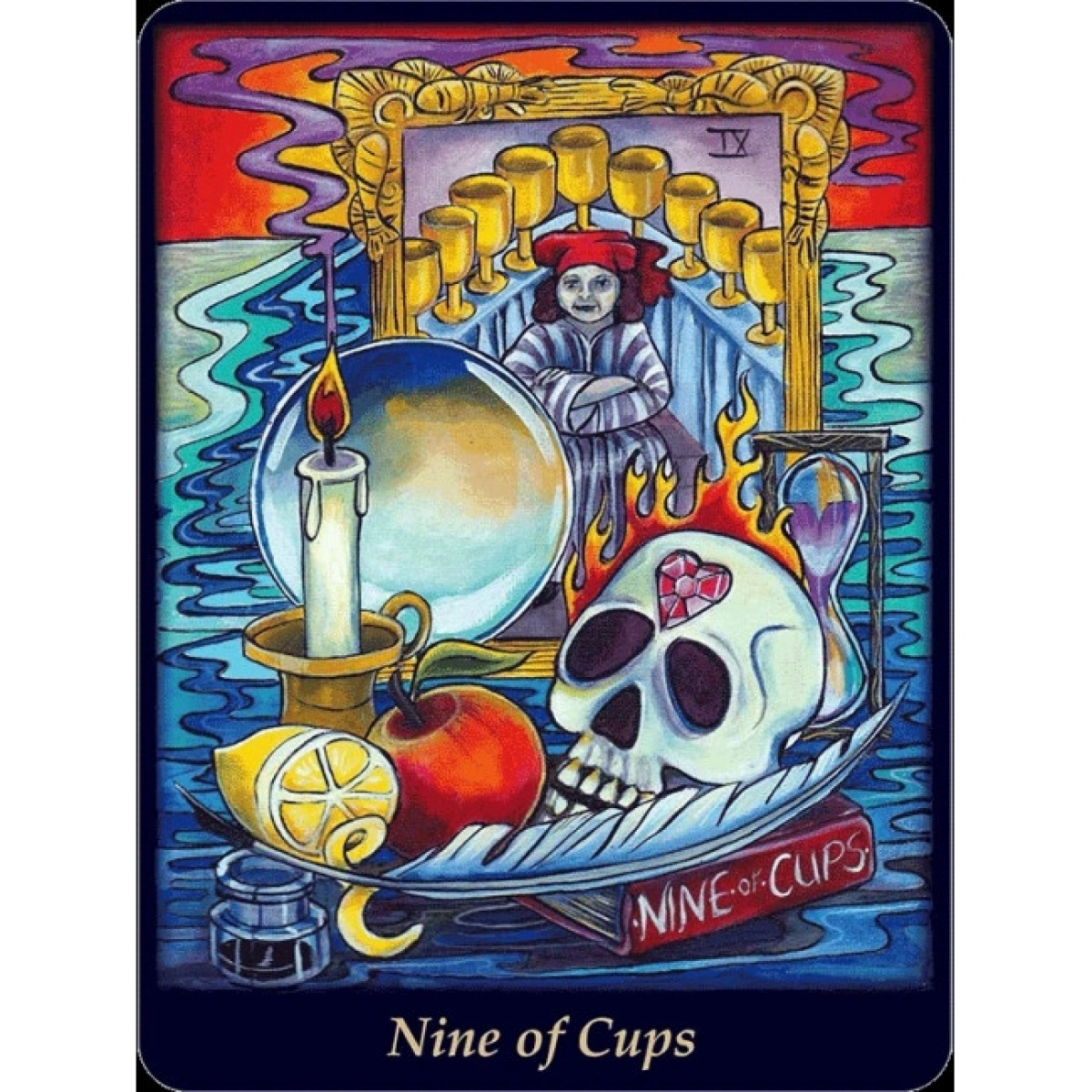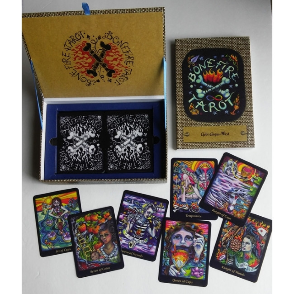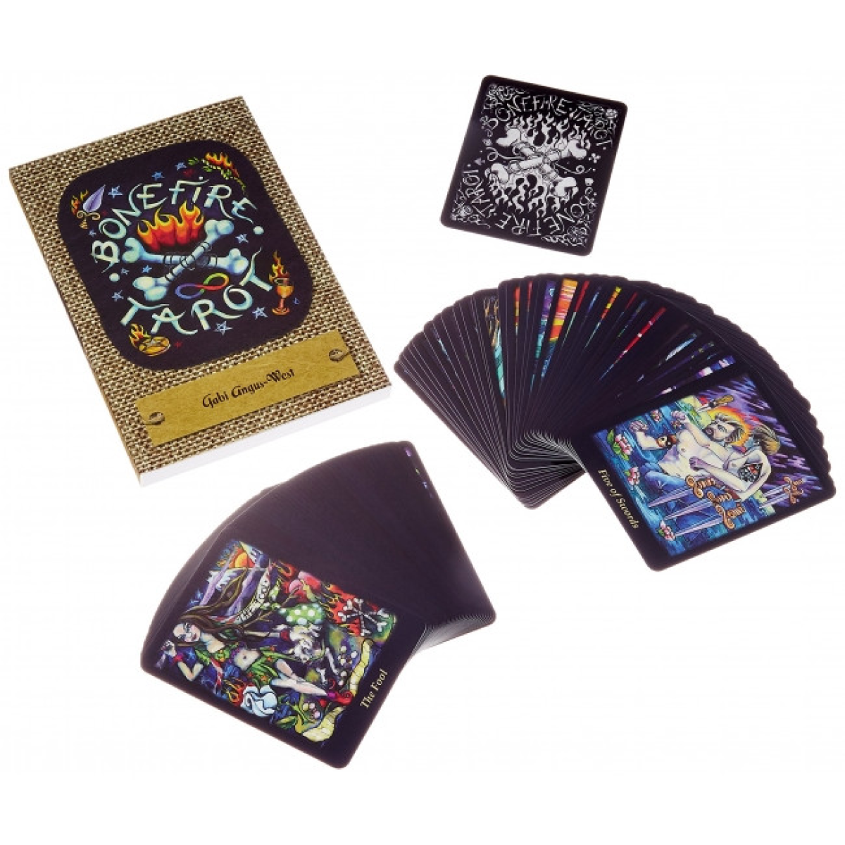 Почніть захоплюючу подорож через феєрію 78 яскравих та вручну намальованих карт Таро, натхнених старовинною, вищою школою татуювання Sailor Jerry Collins. Створена під впливом таро Райдер-Уейт, ця колода та книга-путівник стилізовані для серйозного дослідника життя, що візуально визначає важливі символи та ключові думки, так що ви можете інтуїтивно читати карти та демістифікувати свій власний шлях. Естетично це не приглушена колода. Шанувальники тату будуть раді відзначити, що карти виконані у темно-синьому та яскравих кольорах. Дизайн карт такий же сміливий, з акцентом на звивисті завитки та полум“я. Зображення вискакують із темно-синього фону, і підпис художника – схрещені кістки у вогні – є на кожній карті. У цій колоді не бракує візуальної інтенсивності. І придворним картам, і старшим та молодшим арканам приділяється однакова увага. Хоча всі людські обличчя мають той самий характерний стиль, вони показують емоції, відповідні їх значенням карт. Вузькі темні межі переходять у самі зображення, залишаючи достатньо місця для заголовків унизу. Сорочки карт чорно-білі, із зображенням кістяного вогню в центрі та символами масті у кожному кутку. Таро Вогняних Кістей зберігає назви карт Райдера-Вейта, за винятком Пентаклі, які стали Монетами. Зображення Рірдера-Вейта також можна розрізнити по всій колоді, але дизайнер вніс у них включення та інновації, яких занадто багато, щоб перерахувати. Наприклад, масть Жезлів, Жезли перетворилися на соснові шишки. У «Дев“ятці кубків» ми бачимо добре одягненого, задоволеного чоловіка Уейта-Сміта зі схрещеними руками, з боків якого стоїть низка чашок. Але тут зображення укладено у хитромудру рамку за колекцією предметів на передньому плані: свічка, кришталева куля, перо та пляшечка з чорнилом, яблуко, лимон, череп та пісочний годинник – все, що пливе морем з фоном.