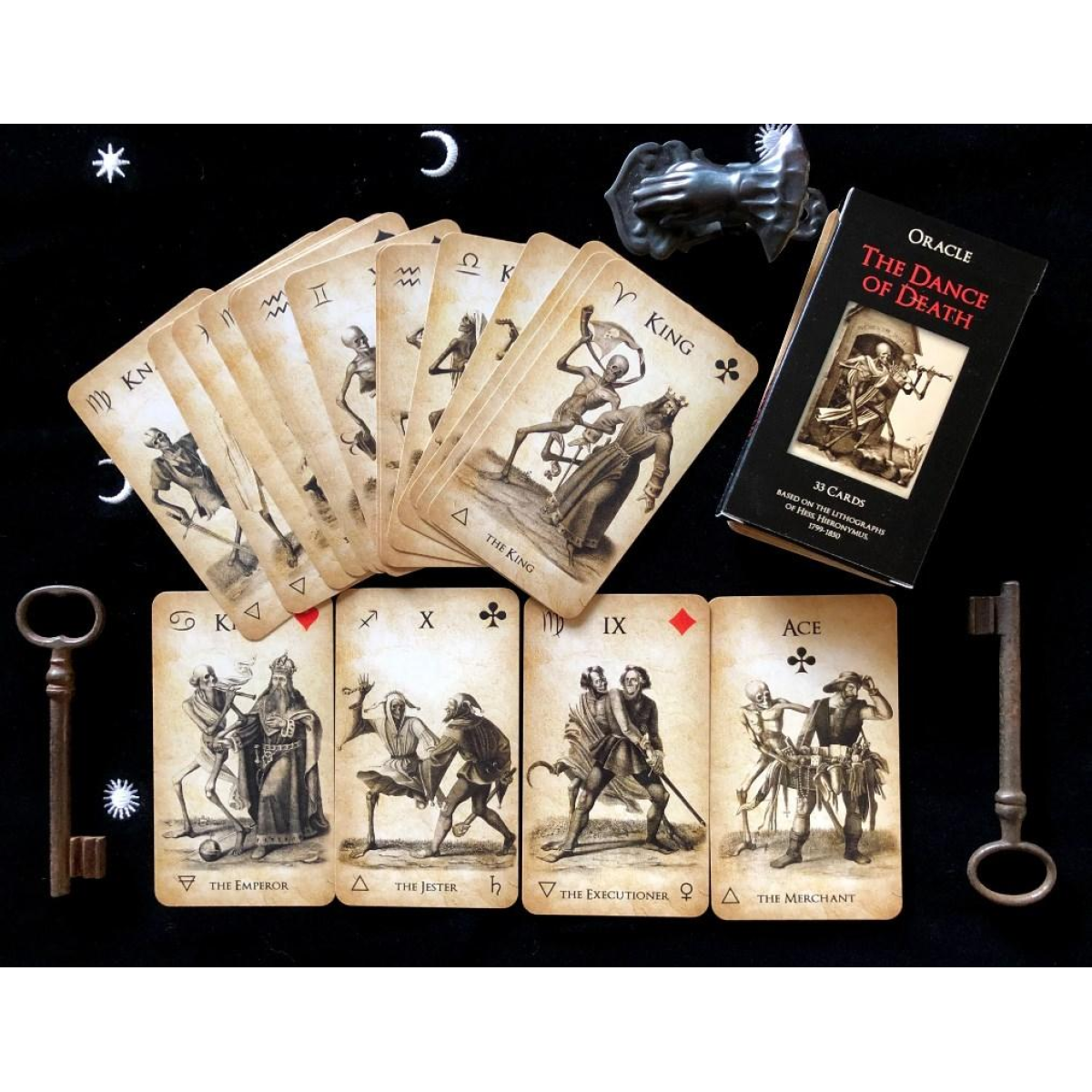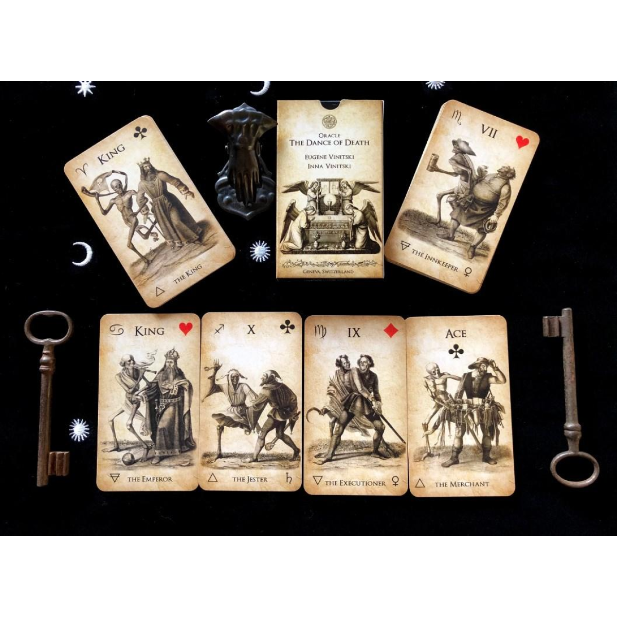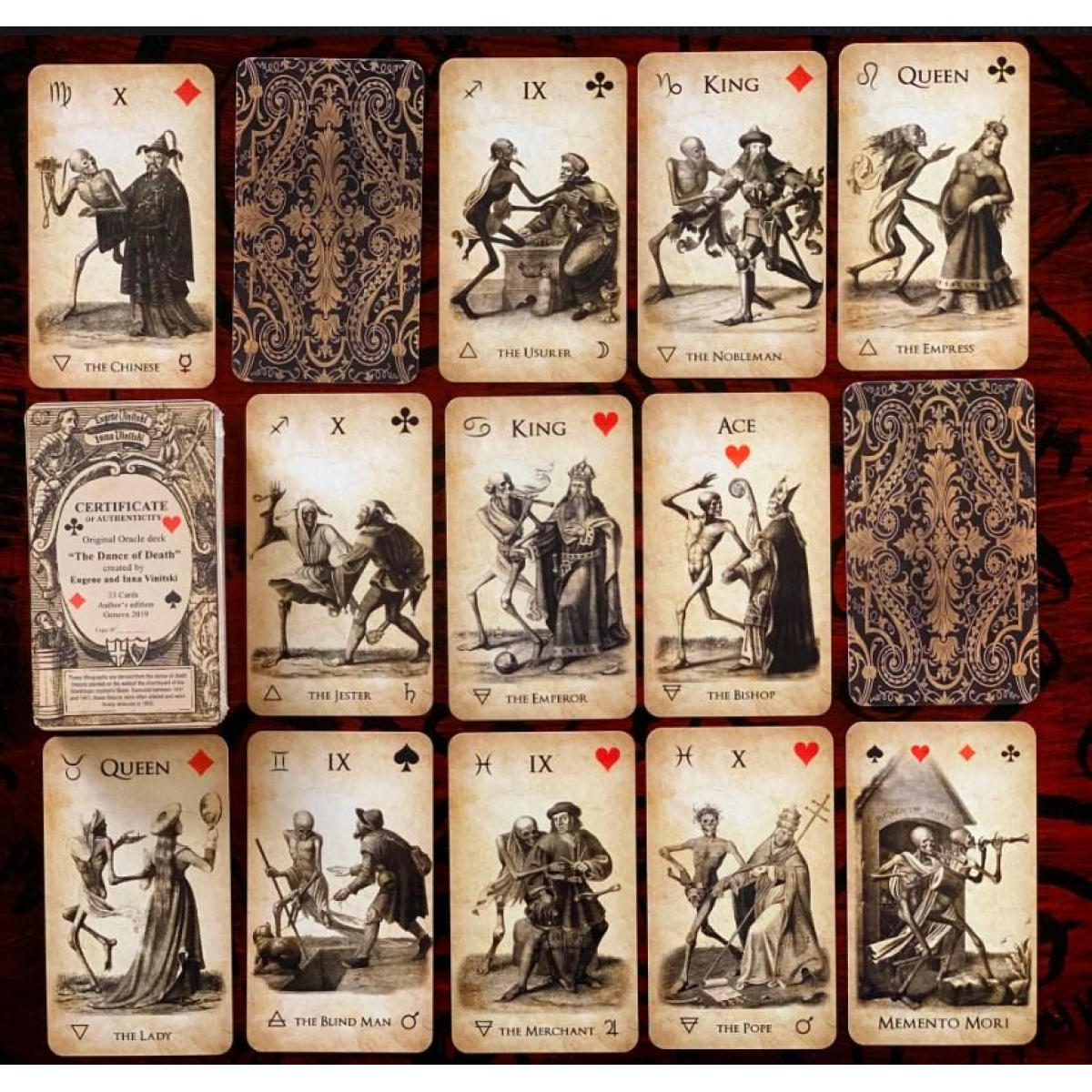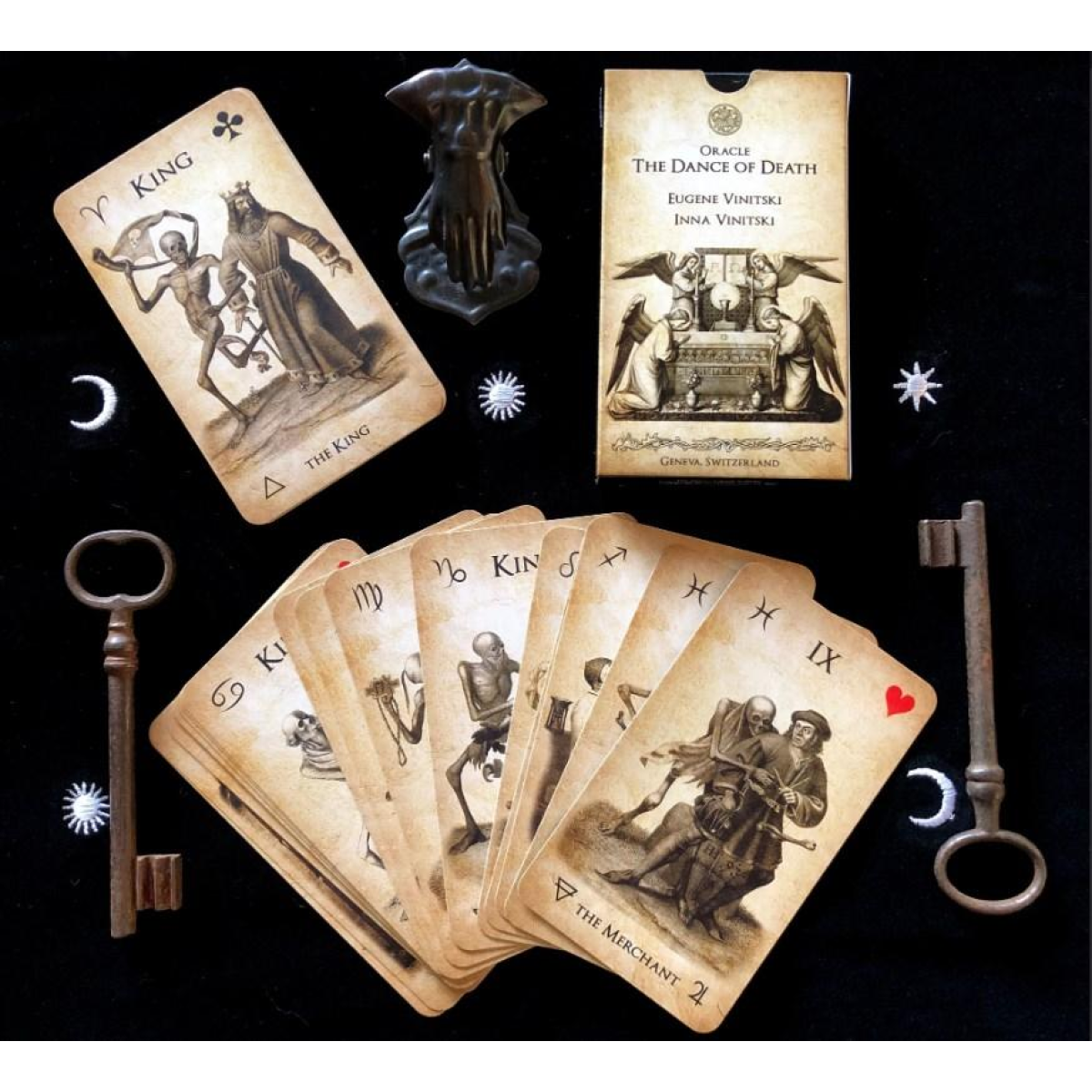 “Танець смерті, також званий danse macabre, середньовічна алегорична концепція всеперемагаючої і врівноважувала б сили смерті, виражена в драмі, поезії, музиці та образотворчому мистецтві Західної Європи, головним чином, в пізньому середньовіччі. Строго кажучи, це літературний або живописне зображення процесії чи танцю як живих, так і мертвих фігур. Ця концепція, ймовірно, отримала поширення в пізньому середньовіччі в результаті одержимості смертю, натхненної епідемією Чорної смерті в середині 14 століття і спустошливої Столітньою війною (1337-1453) між Францією та Англією.. Танець смерті часто з“являється на фризах, що прикрашають клуатры монастирів (відкриті двори яких зазвичай містять кладовища) і нефи церков. Однією з найвідоміших була розпис кладовища Домініканського монастиря в Базелі. На оригіналі 1440 року зображені 37 пар, що зображують смерть, звернених до смертним. Фрески не тільки кілька разів реставрували, але навіть змінювали. У 1805 році знесли стіну, і збереглося всього 19 фрагментів. Деякі фрагменти стін зберігаються в Історичному музеї Базеля. Ієронім Гесс (1799-1850) був художником з Базеля. У 1839 році Гессу було доручено скопіювати акварелі Емануеля Бюхеля (1705-1775), що зображують танець смерті в Базелі. Тут ми маємо на увазі традиційні значення карт, їх комбінації і традиційні розклади. Ми надрукували і додали в цю колоду 4 додаткові пронумеровані картки (картки 6), якщо ви хочете використовувати колоду з 36 карт. Ви отримаєте їх разом з цією колодою.“ (Vinitski)