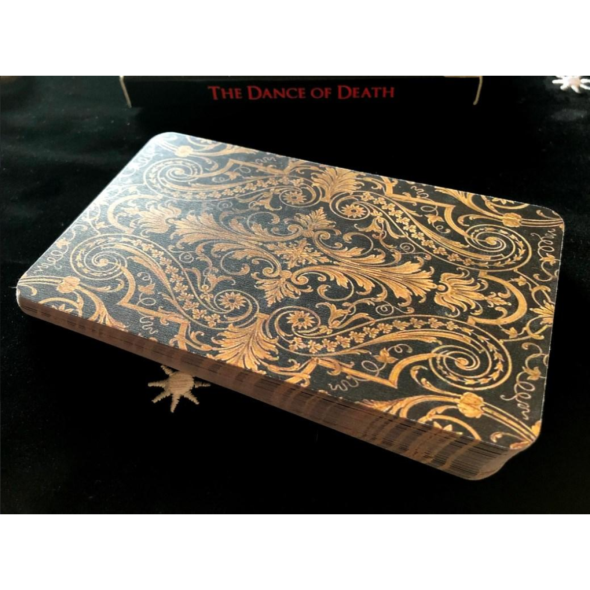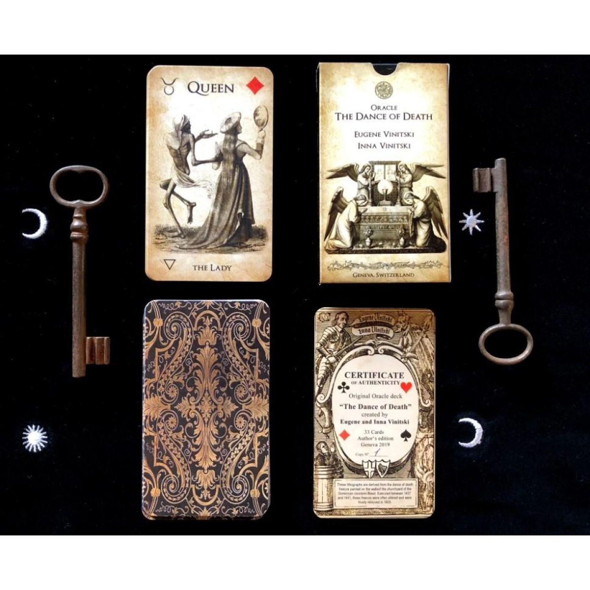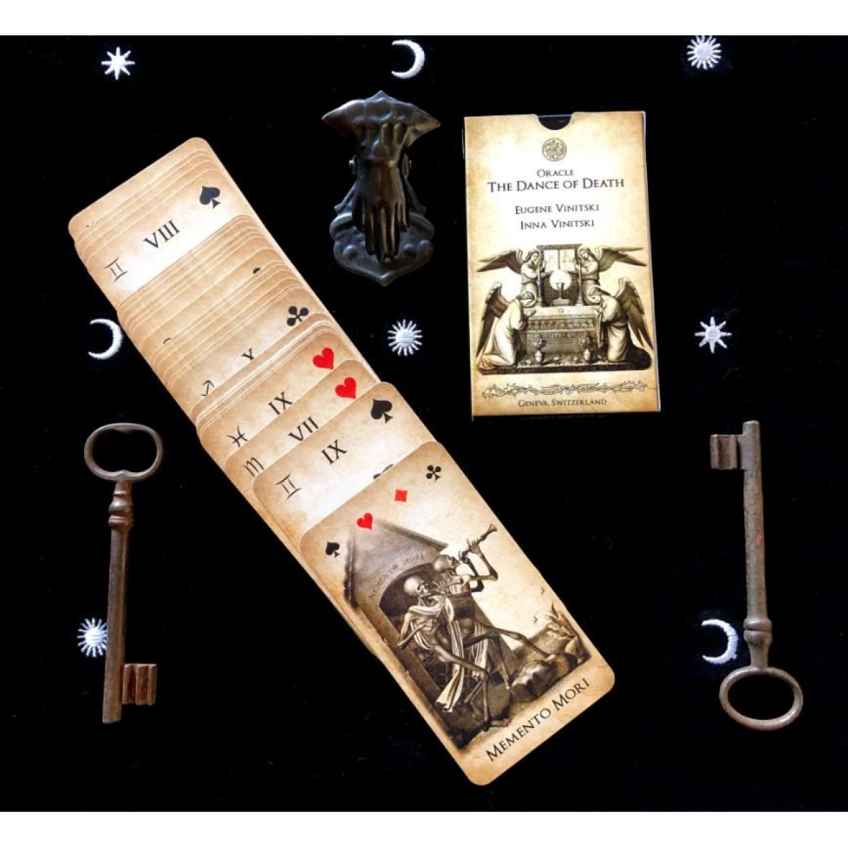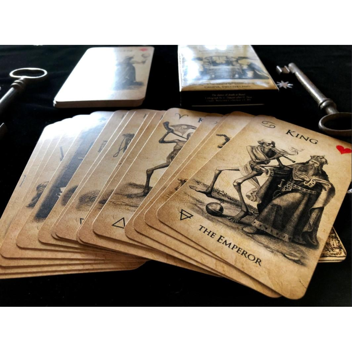 “Танець смерті, також званий danse macabre, середньовічна алегорична концепція всеперемагаючої і врівноважувала б сили смерті, виражена в драмі, поезії, музиці та образотворчому мистецтві Західної Європи, головним чином, в пізньому середньовіччі. Строго кажучи, це літературний або живописне зображення процесії чи танцю як живих, так і мертвих фігур. Ця концепція, ймовірно, отримала поширення в пізньому середньовіччі в результаті одержимості смертю, натхненної епідемією Чорної смерті в середині 14 століття і спустошливої Столітньою війною (1337-1453) між Францією та Англією.. Танець смерті часто з“являється на фризах, що прикрашають клуатры монастирів (відкриті двори яких зазвичай містять кладовища) і нефи церков. Однією з найвідоміших була розпис кладовища Домініканського монастиря в Базелі. На оригіналі 1440 року зображені 37 пар, що зображують смерть, звернених до смертним. Фрески не тільки кілька разів реставрували, але навіть змінювали. У 1805 році знесли стіну, і збереглося всього 19 фрагментів. Деякі фрагменти стін зберігаються в Історичному музеї Базеля. Ієронім Гесс (1799-1850) був художником з Базеля. У 1839 році Гессу було доручено скопіювати акварелі Емануеля Бюхеля (1705-1775), що зображують танець смерті в Базелі. Тут ми маємо на увазі традиційні значення карт, їх комбінації і традиційні розклади. Ми надрукували і додали в цю колоду 4 додаткові пронумеровані картки (картки 6), якщо ви хочете використовувати колоду з 36 карт. Ви отримаєте їх разом з цією колодою.“ (Vinitski)
