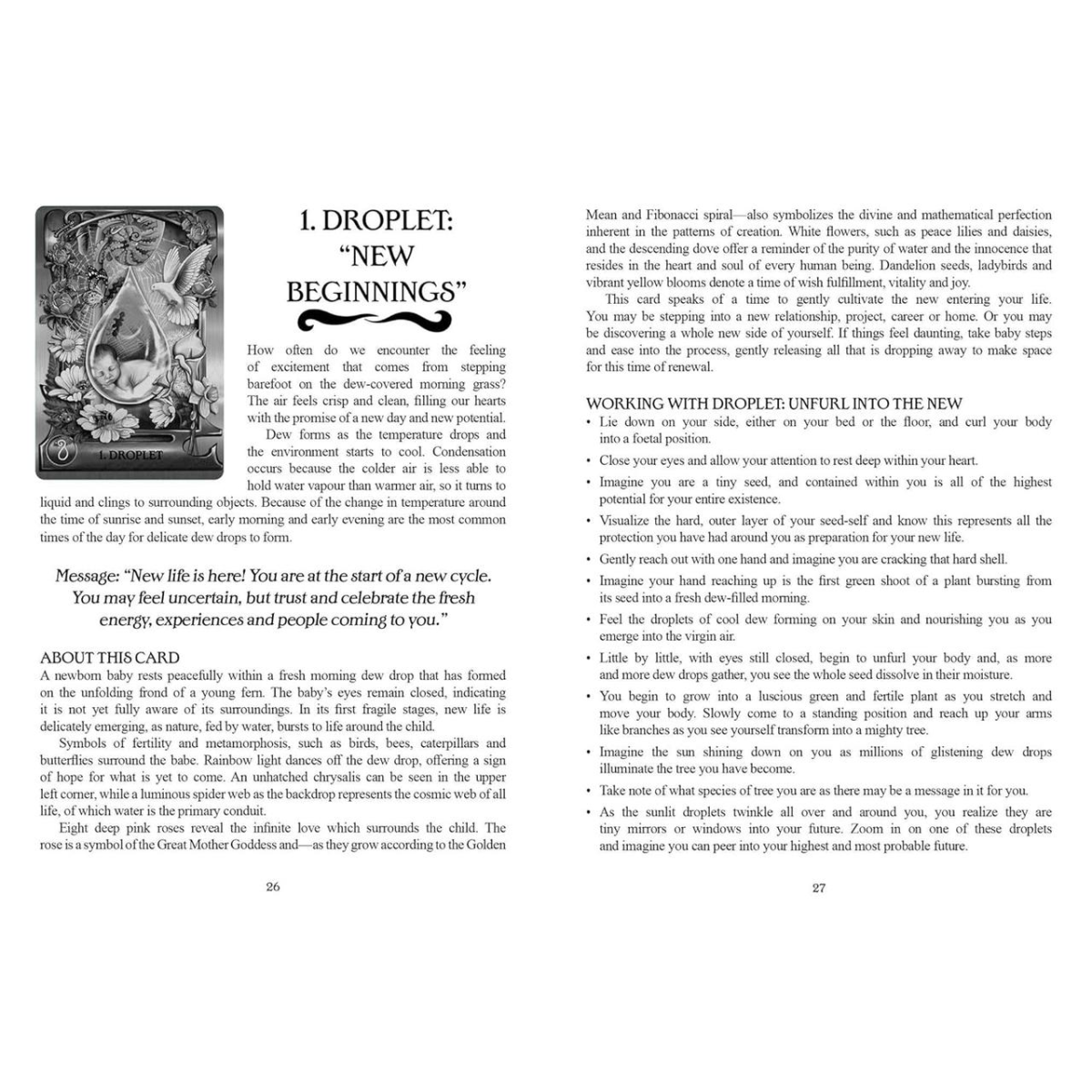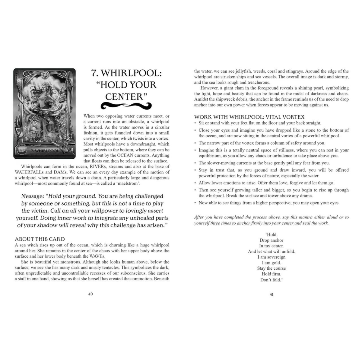 Повнокольорова колода оракулів і посібник для роботи з цілющою, магічною та алхімічною мудрістю води • Містить 40 повнокольорових карток із високою вібрацією, на кожній зображено водну стихію природи, втілену девами, ундінами, русалками та іншими зв“язувальними естотами. • Пропонує детальну інтерпретацію кожної карти, пояснюючи цілющі та очищувальні властивості кожної священної водойми разом із направленим повідомленням і вказівками від водних істот • Надає захоплюючі вправи, практичні ритуали та техніки прояву для вивчення духовної практики алхімії священної води Вода – найсвятіша стихія на нашій планеті. Воно всюди, всередині нас і навколо нас, і без нього не може бути життя. Як духовний елемент, вода тісно пов’язана з нашим емоційним світом і силою інтуїції, а також узгоджена з божественною жіночою мудрістю. Працюючи з енергією води, ми можемо виявити зцілення, трансформацію, керівництво, чудеса та втілення наших мрій. У цьому оракулі зцілення та віщування Олександра Венман бере вас в алхімічну подорож, щоб попрацювати з цілющою мудрістю води, щоб покращити вашу інтуїцію, додати більше плинності та гнучкості у ваше повсякденне життя та запропонувати особисту цілющу енергію забрудненим і пошкодженим водним шляхам наш світ. 40 повноколірних карток з високою вібрацією зосереджені на водних елементах природи, таких як водоспади, озера, туман, лід і священні водойми, кожна з яких чудово проілюстрована водною сценою з магічними істотами, такими як німфи, русалки, ундіни, богині, деви та інші божества. Супровідний путівник пропонує детальну інтерпретацію кожної карти, пояснюючи цілющі та очищувальні властивості кожної священної водойми разом із направленим повідомленням і керівництвом від водяних істот, Охоронців, Ангелів і Рад Світла. Він також містить захоплюючі вправи, практичні ритуали та техніки прояву для вивчення потужної практики алхімії священної води, духовного процесу, який допоможе вам зрозуміти глибину та діапазон ваших емоцій, очистити своє нижче «я», возз’єднатися зі своїм божественним «я», розкрити своє духовні дари і творити чудеса. Коли ви глибше занурюєтесь у таємницю священних вод із цим оракулом, ви подорожуватимете глибше в себе, щоб отримати ясність, розкрити приховані скарби, вилікувати невирішені проблеми та знайти в собі сміливість рухатися вперед і плисти в ритмі життя.