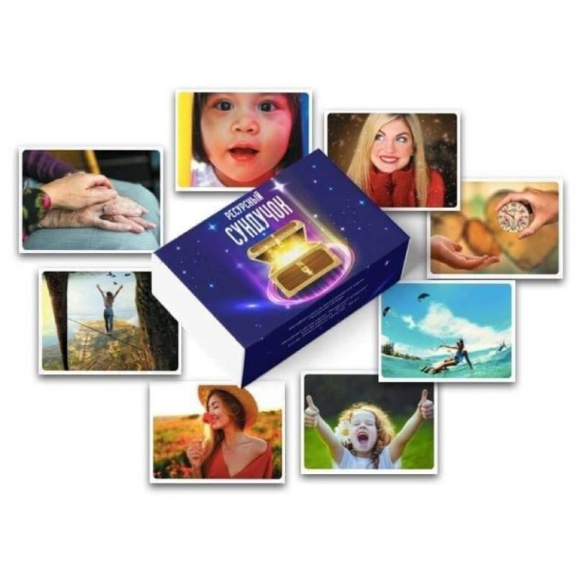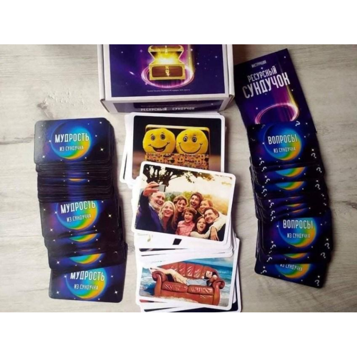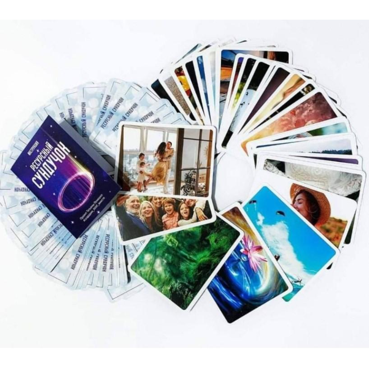 Метафоричні карти “Ресурсна скринька“ - унікальна колода, яка створена в синергії великою кількістю авторів, які вклали своє бачення та свою душу у створення цієї колоди. Колода покликана допомагати знаходити ресурси у різних темах та напрямках. Колода мудра і глибока, що говорить з Душею м“яко і дбайливо. Кожна картинка глибоко метафорична і багатошарова, вона відбиває не один ресурс, а кілька. Текстові картки з висловлюваннями та питаннями складені настільки глибоко і трепетно, продумані до дрібниць таким чином, щоб обійшовши можливий опір, м“яко та ненав“язливо допомогти почути свої справжні бажання, свою Душу, підштовхнути до пошуку відповідей у глибині свого Я та відкрити скарбницю РЕСУ у своєму житті. Колоду можна використовувати як окремий інструмент, так і поєднувати її з іншими колодами та арт-техніками. Вона чудово підійде для ігор, для коучингу та терапії. Її можуть використовувати у своєму арсеналі як фахівці професій, що допомагають, так і люди, яким цікава тема саморозвитку для самостійної роботи з собою. Адже це колода про чари бачити свої ресурси. Заглядаючи в «Ресурсну скриньку» в моменти, коли не вистачає мотивації, енергії, сили – Ви відкриваєте у невичерпну криницю ресурсів у своєму житті, всередині своєї особистості та у зовнішньому світі, так необхідних у будь-якій сфері нашого життя. Вона містить у собі: 42 ресурсні фотокартки (розмір 90*120 мм) 42 послання від скрині - це глибинні мудрі фрази (розмір карт 60*90мм) 42 питання від скриньки - це м“які підтримуючі питання, що допомагають знайти свою власну відповідь у собі (розмір карт 60*90 мм) Коробочка