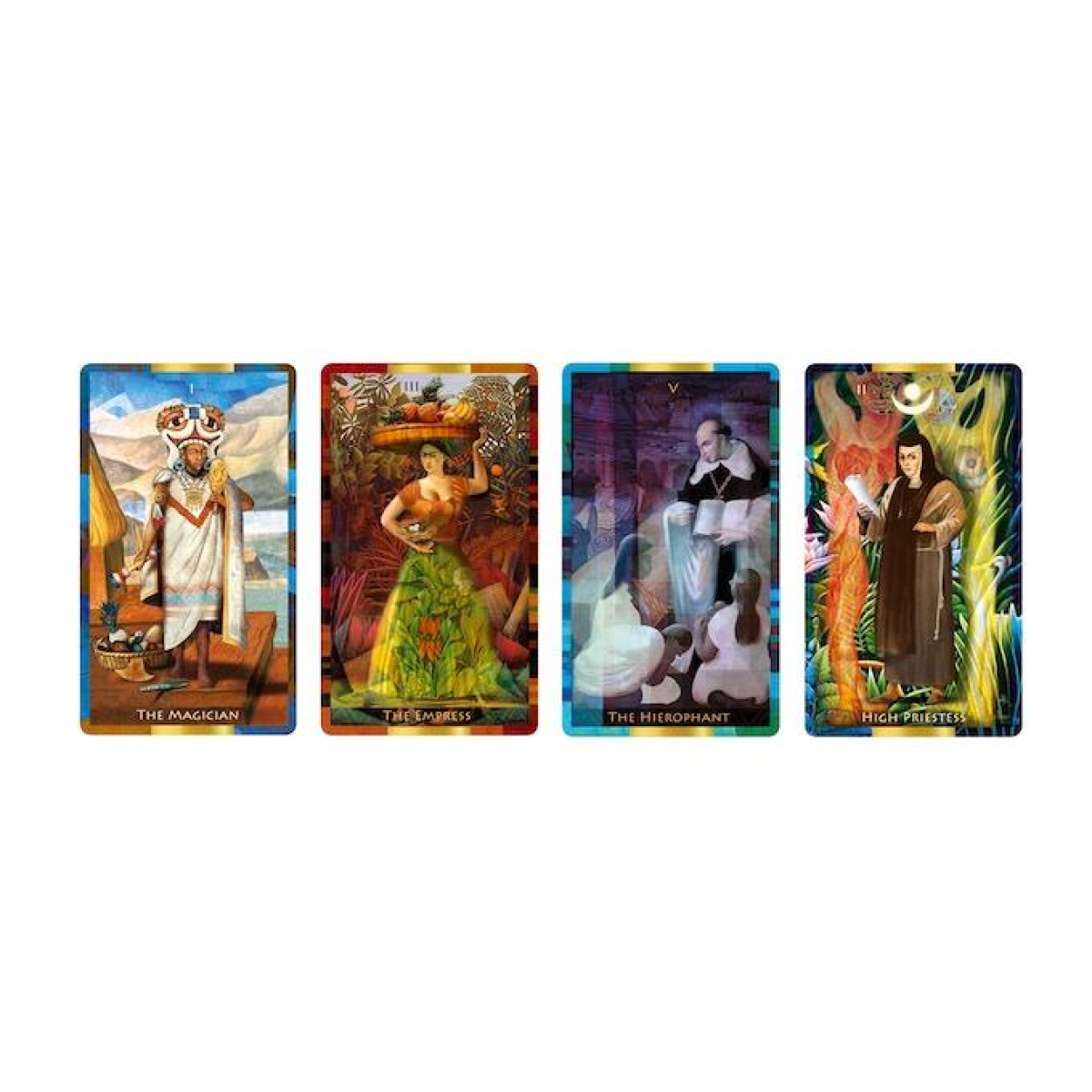 У цій колоді ми, її творці, не претендуємо на повну історичну та етнографічну достовірність відображених у ній подій, сцен і персонажів. Але ми постаралися вкласти в зображення та опис листівок те, що торкає серце, привертає увагу, пробуджує розум, зачаровує своєю незвіданою та таємничою глибиною, а також наше щире захоплення цією великою культурою. Чи готові ви, взявши в руки цю нову колоду Таро Alma Latina, вирушити в захоплюючу подорож таємничими паралельними світами Месоамерики? Коли у вас в руках ця дивовижна, яскрава і драматична колода, ви відразу зрозумієте, яке багатство культурної символіки і магічної сили в ній зосереджено. Ви будете оповиті чарівною атмосферою таємничості, що міститься в ньому, і миттєво захопите його запальним темпераментом. Дивовижна, ще не до кінця досліджена стародавня цивілізація, просякнута легендами про Космос, про церемоніальну магію, золото та боротьбу за свободу – ось про що вам розкажуть зображення на кожній картці. На його зображеннях ви побачите парадоксальну зустріч різноманітних світових культур, які зливаються з найбагатшою культурою майя, інків та ацтеків, що призводить до унікального поєднання, здавалося б, несумісних релігій і світоглядів, чаклунства та ідеологічних устремлінь.