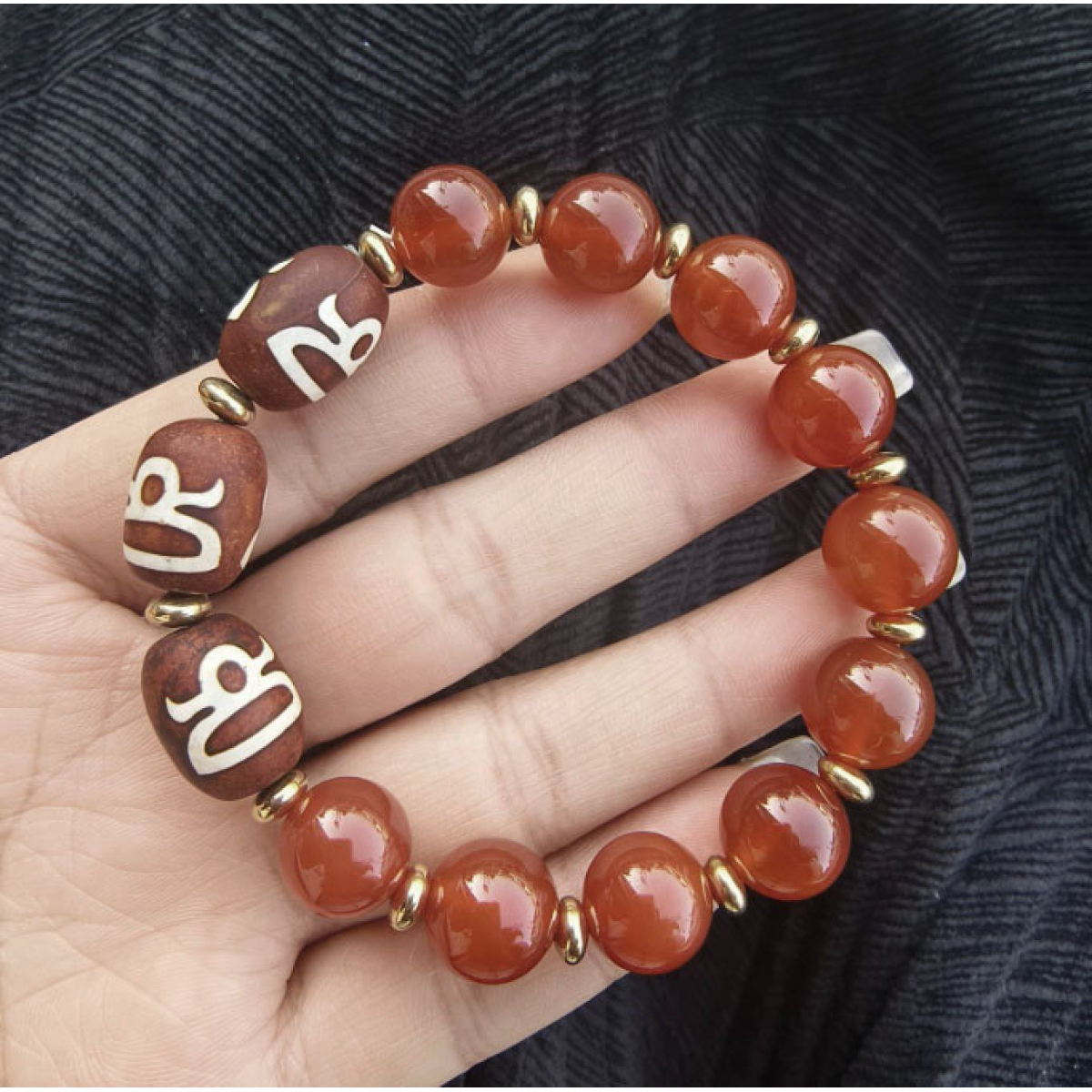 Браслет ДЗІ три намистини Бог багатства з червоним агатом