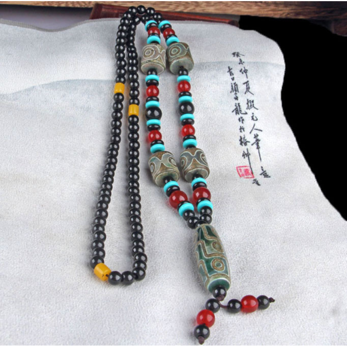 Кольє Зелено-коричнева ДЗІ 9 очей і чотири бочонки на 3 ока