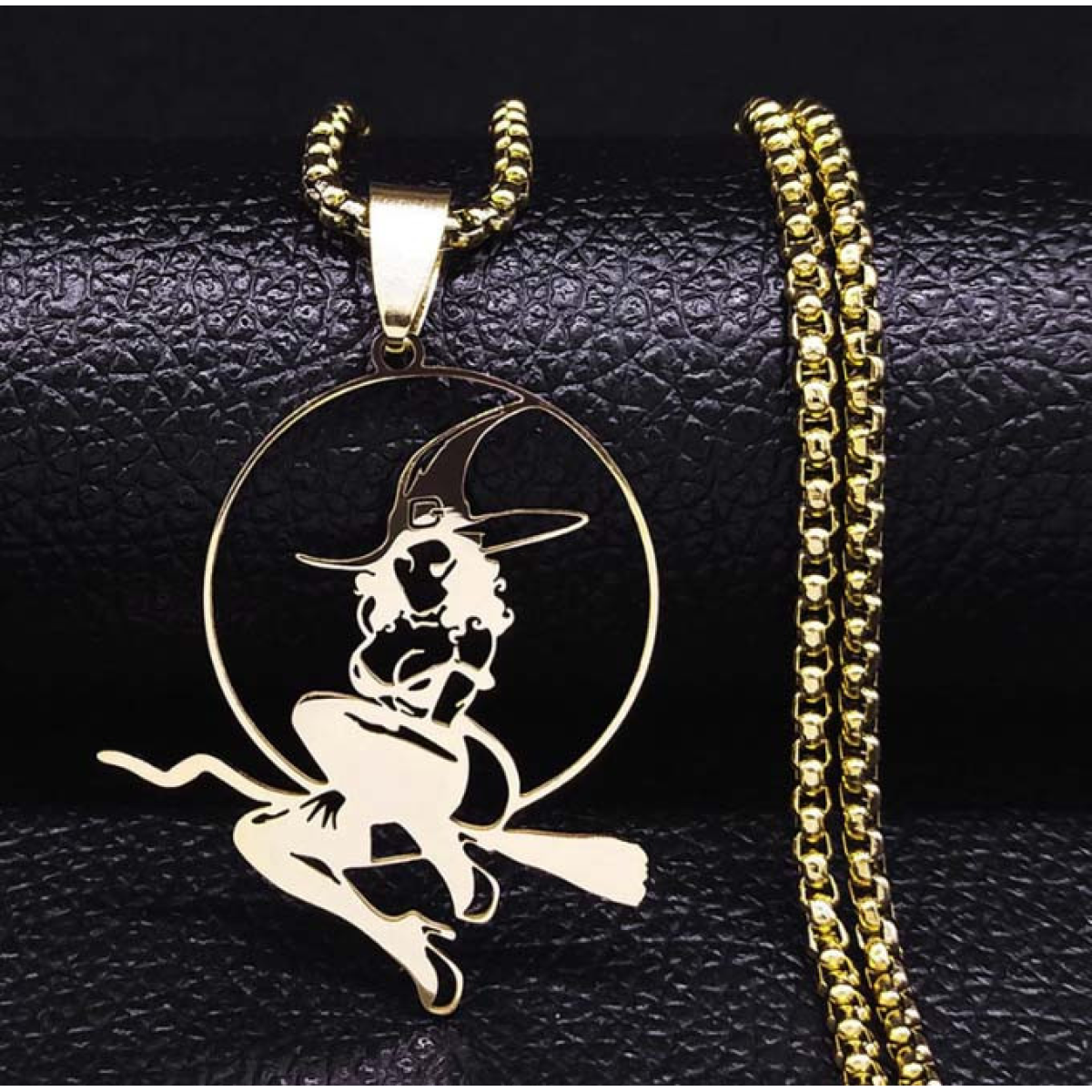 Відьма на мітлі у колі жовтий метал з ланцюжком 60см.