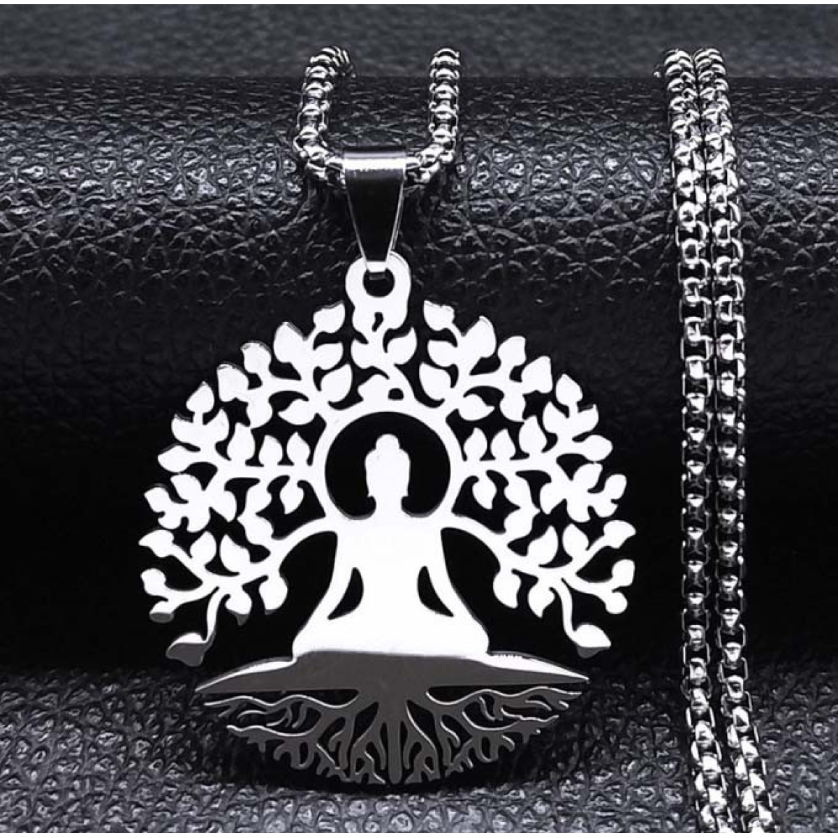 Древо Життя з Буддою білий метал з ланцюжком 60см.