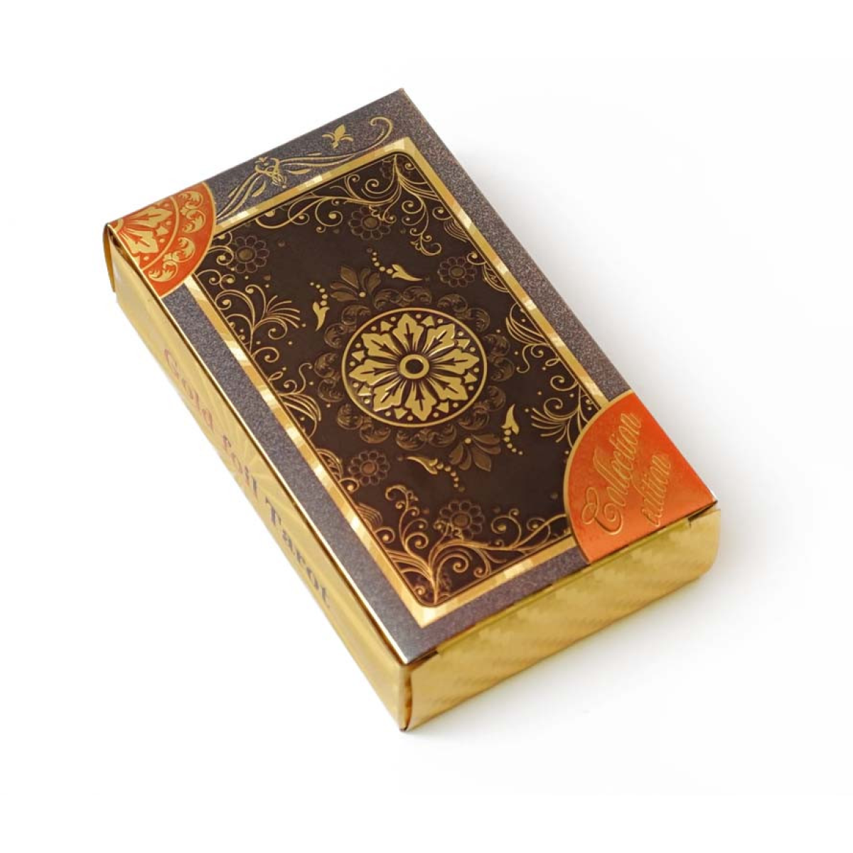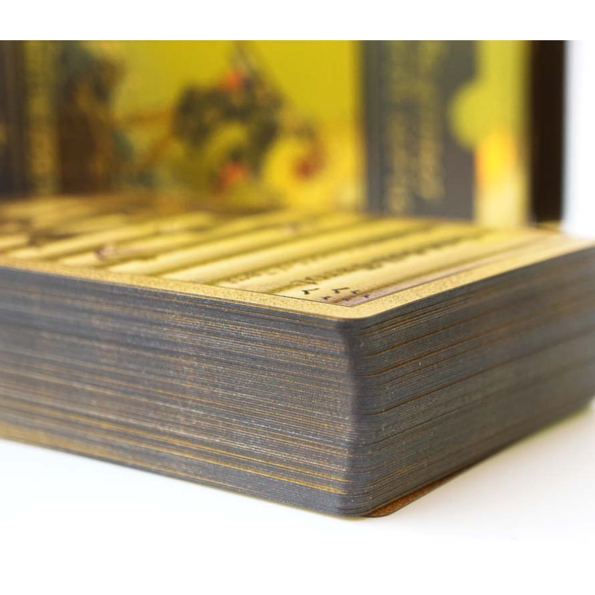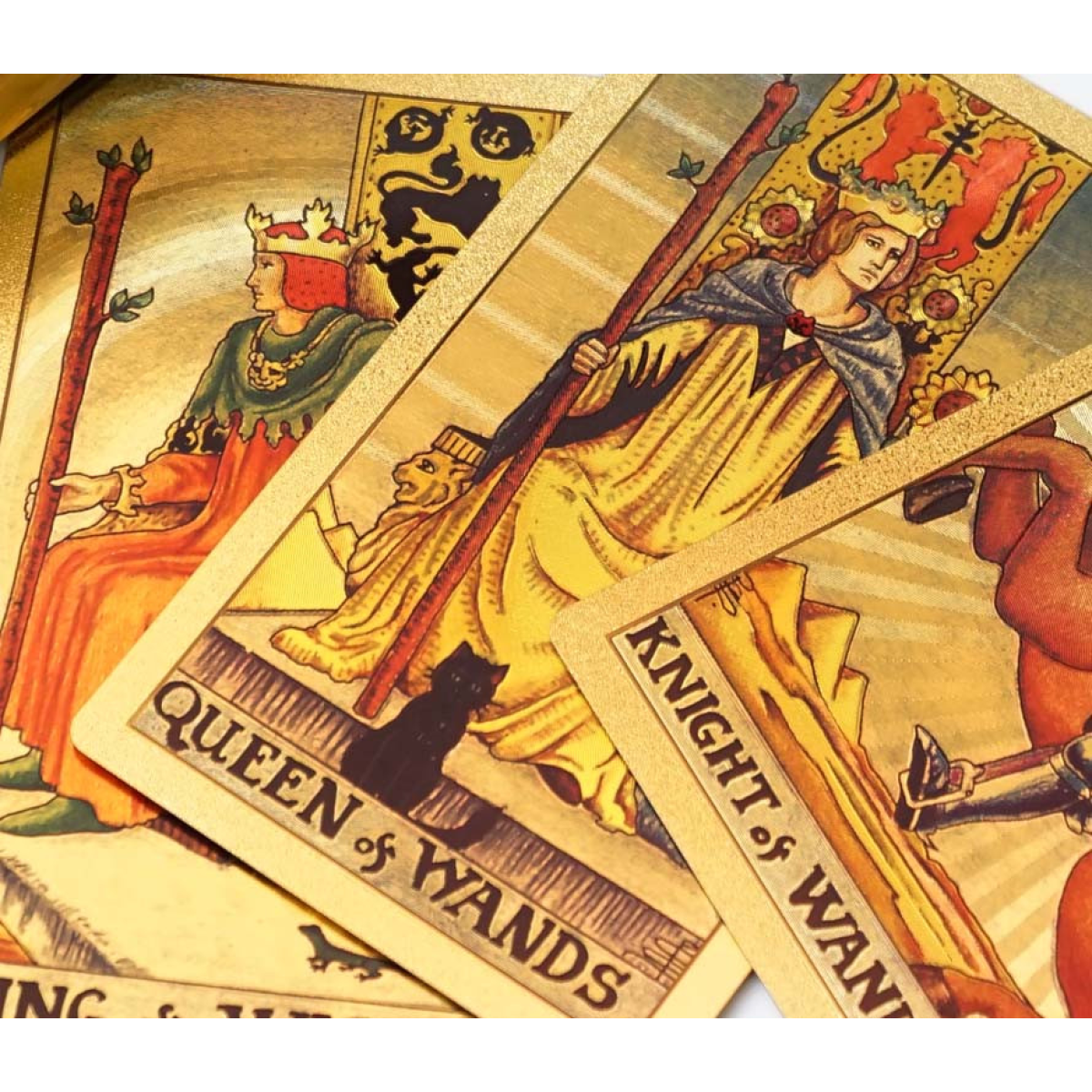 Розмір карти 12*7см. Шикарний варіант карток Таро Уейта, виконаний на пластиці методом гарячого тиснення. Золота фольга та пластик роблять карти «люксовими» візуально, і при цьому дуже щільними, гнучкими та зносостійкими.