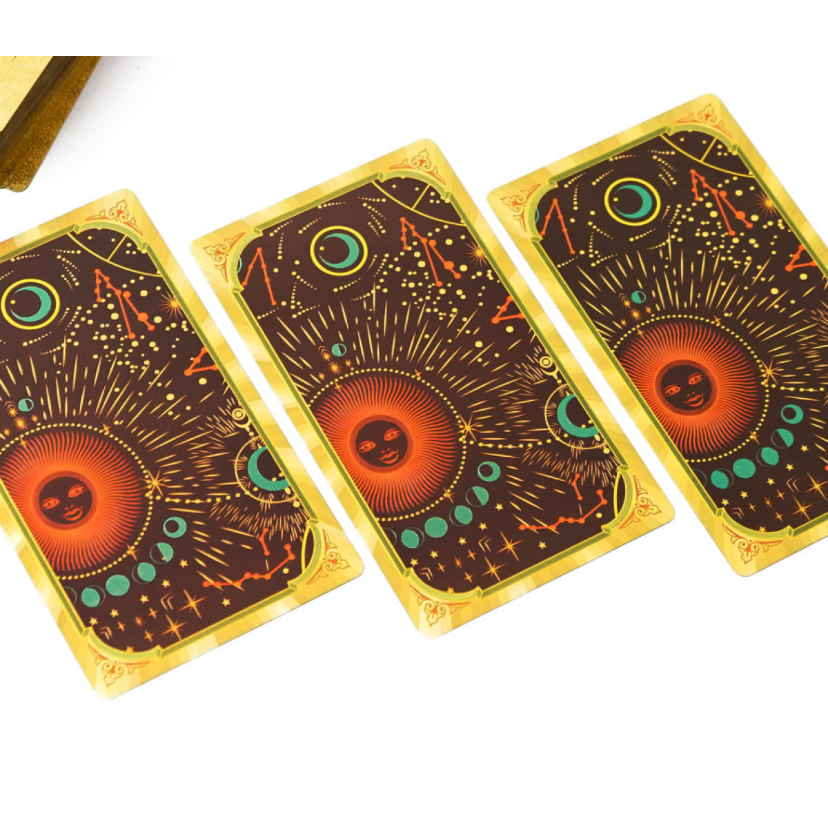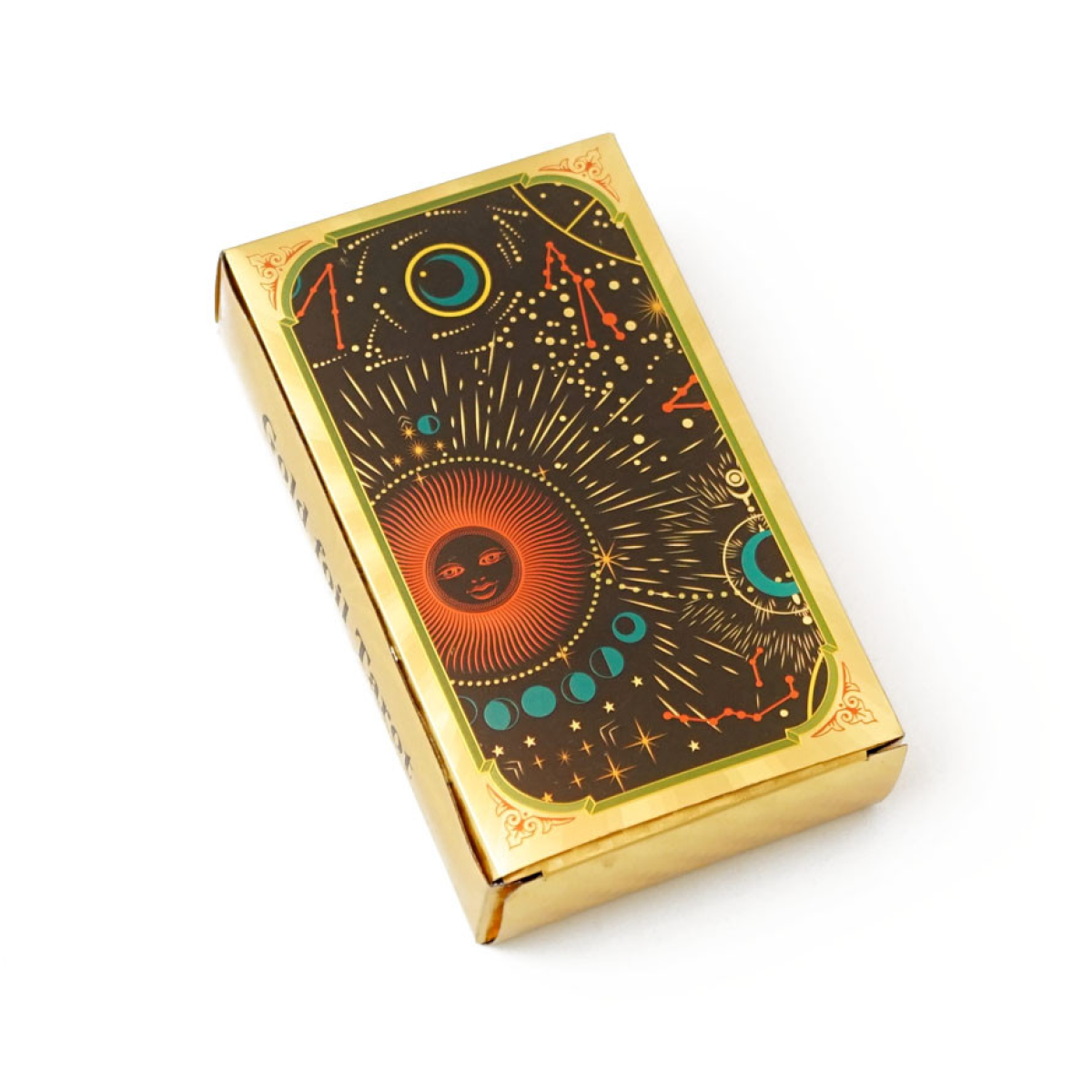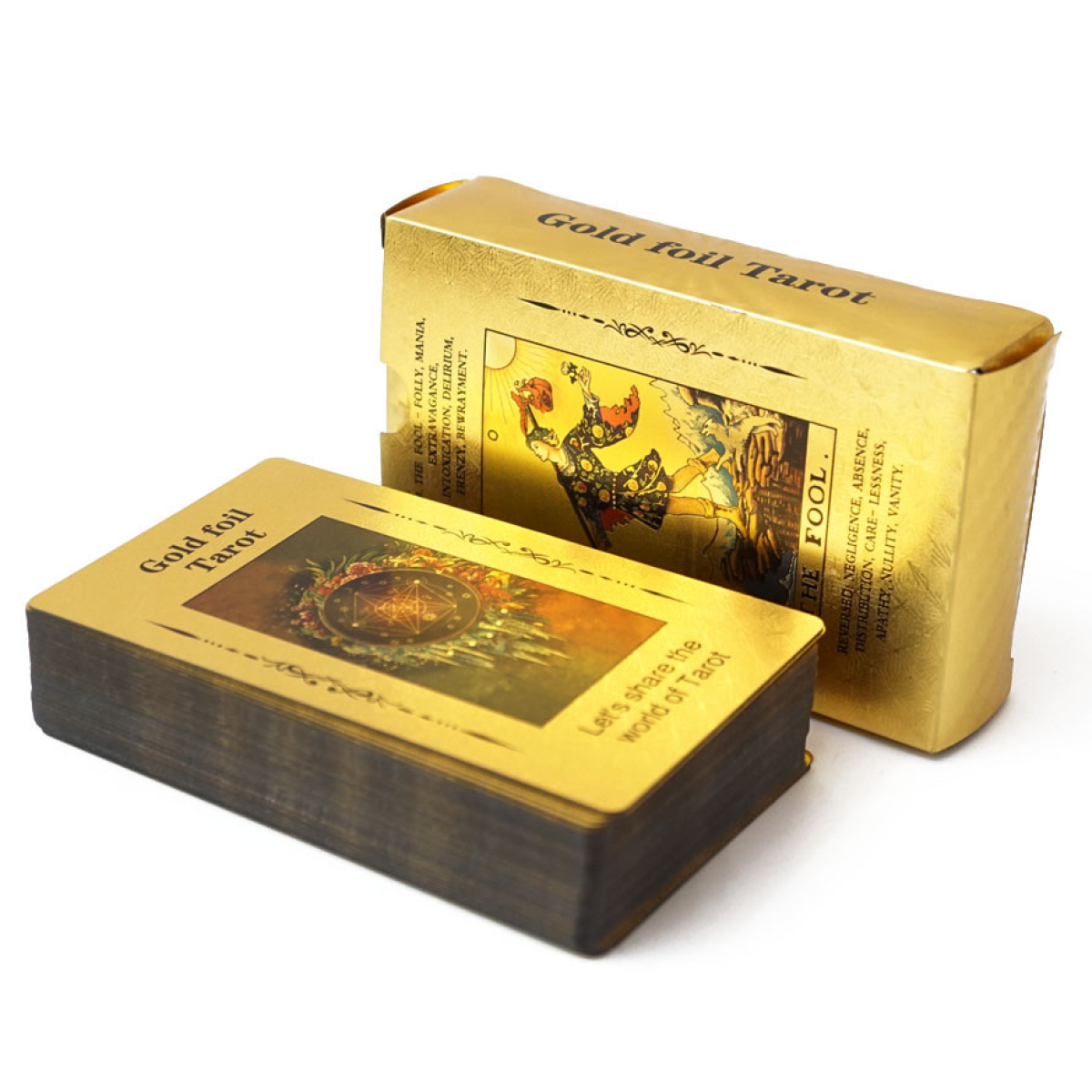 Розмір карти 12*7см. Шикарний варіант карток Таро Уейта, виконаний на пластиці методом гарячого тиснення. Золота фольга та пластик роблять карти «люксовими» візуально, і при цьому дуже щільними, гнучкими та зносостійкими.