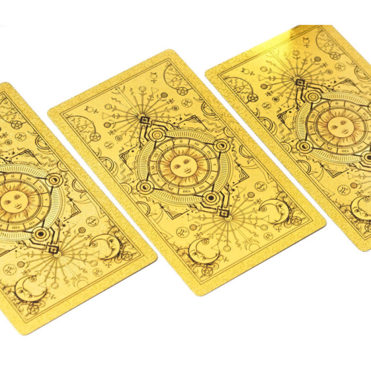 Розмір карти 12*7см. Шикарний варіант карток Таро Уейта, виконаний на пластиці методом гарячого тиснення. Золота фольга та пластик роблять карти «люксовими» візуально, і при цьому дуже щільними, гнучкими та зносостійкими.