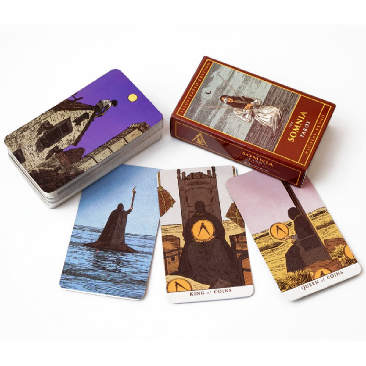 Розмір карти 10 * 5,8см. Досліджуйте світ Таро через бачення Ніколя Бруно, художника, який перетворює свої сни та кошмари на сюрреалістичні образи. Кожен твір Таро Сомнії демонструє роботи Бруно у сфері фотографії, скульптури та дизайну костюмів. Посилання зроблено на колоду Таро Райдера-Уейта, а також на юнгіанські архетипи. Колода є найамбіційнішим проектом художника на сьогоднішній день, оскільки він веде хроніку всієї колоди карт Таро з усіма її мастями в чудовому краєвиді сновидінь про його сонний параліч. Бруно використовує свої типові характери, настрої, символічні колони і задники в захоплююче гострої адаптації Старших і молодших арканів, сімдесят вісім нових фотографій, супроводжуваних трьома попередніми малюнками. Ця колекція із вісімдесяти одного твору є найбільшою серією художника на сьогоднішній день і унікально та елегантно втілює позачасові сюжети колоди Таро. Художні роботи Бруно відбивають його довічну боротьбу із сонним паралічем. Його художній процес представляє і фіксує кожен крок його катарсичної подорожі - від малювання сну в момент пробудження до створення декорацій та костюмів і, зрештою, вживання себе у більшість цих ролей. Кожен аспект сприяє терапевтичному зціленню, оскільки художник бере під контроль ці поширені тривоги страху, самотності та прагнення до чогось, які пронизують як наш сон, так і неспання. Уміння Бруно справлятися з цими кошмарами та тривогами за допомогою своїх художніх починань робить його підсвідому одісею ще на один крок далі, охоплюючи та розширюючи емпатію та колективний зв“язок.