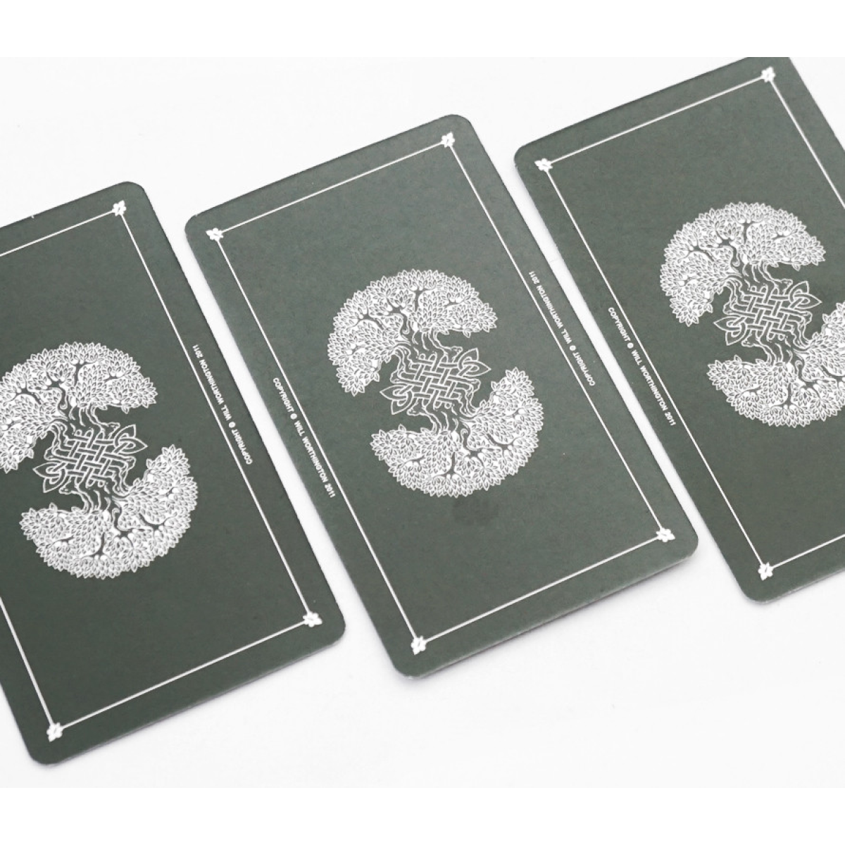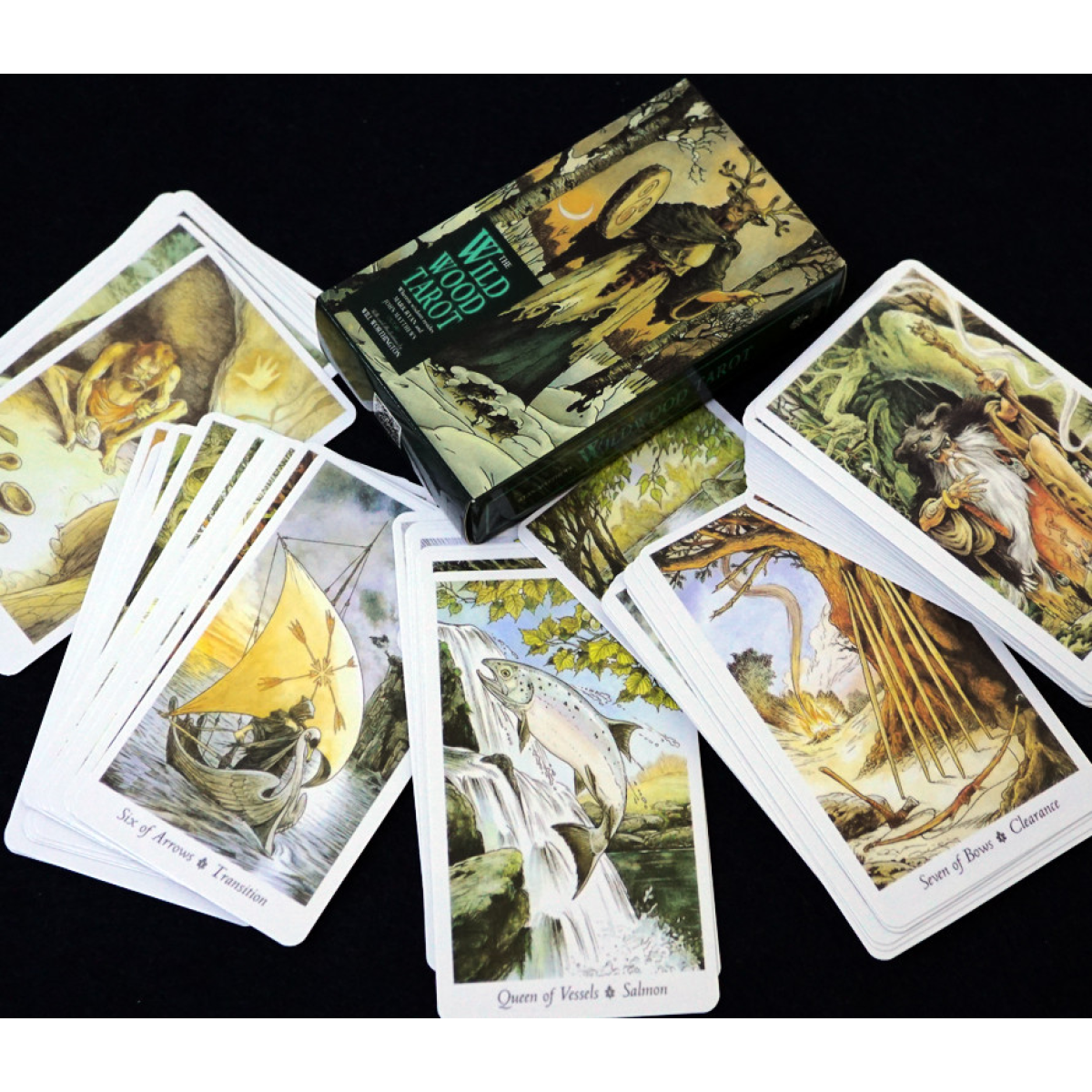 Розмір карти 10,2*6см. Таро Дикого лісу – це вдосконалена та переосмислена версія Greenwood Tarot. Карти пронизані енергією Природи, магічного лісу та міфологічною атмосферою давніх кельтських традицій. Щира та природна, як сама Природа, ця колода працює з дивовижною точністю та акуратністю, інтерпретуючи життєві події через міфологічні символи та обожнювані образи мешканців Дикого Лісу. Трактування колоди близьке до класичної системи Райдера-Уейта. Основною ідеєю для колоди стала концепція зміни сезонів, герої та символіка давньомовних свят. Тут ви зустрінете образи Зеленої Жінки та Зеленого Чоловіка, Сонця Життя, Відображення, Зберігача Традицій, рідного Дому, Колеса року та інші образи, пов“язані з Лісом та легендами давнини. Розгорнуте трактування кожної карти описано в ілюстрованій книзі The Wildwood Tarot (160 сторінок) російською мовою, яка додається до цього подарункового видання. У ній ви знайдете опис, трактування та рекомендації до прочитання карти у поєднанні з іншими. Примітно, що до кожної карти Молодших Арканів є додатковий напис на карті, що пояснює, поряд з основною назвою. Масти цієї колоди відповідають тематиці колоди та представлені як Стріли, Луки, Камені та Чаші. Ілюстрації до цієї атмосферної колоди виконані вручну акварельними фарбами. Насичені кольори, велика кількість лісової зелені та старовинних пейзажів створюють умиротворений, проникливий та серйозний настрій цієї колоди.