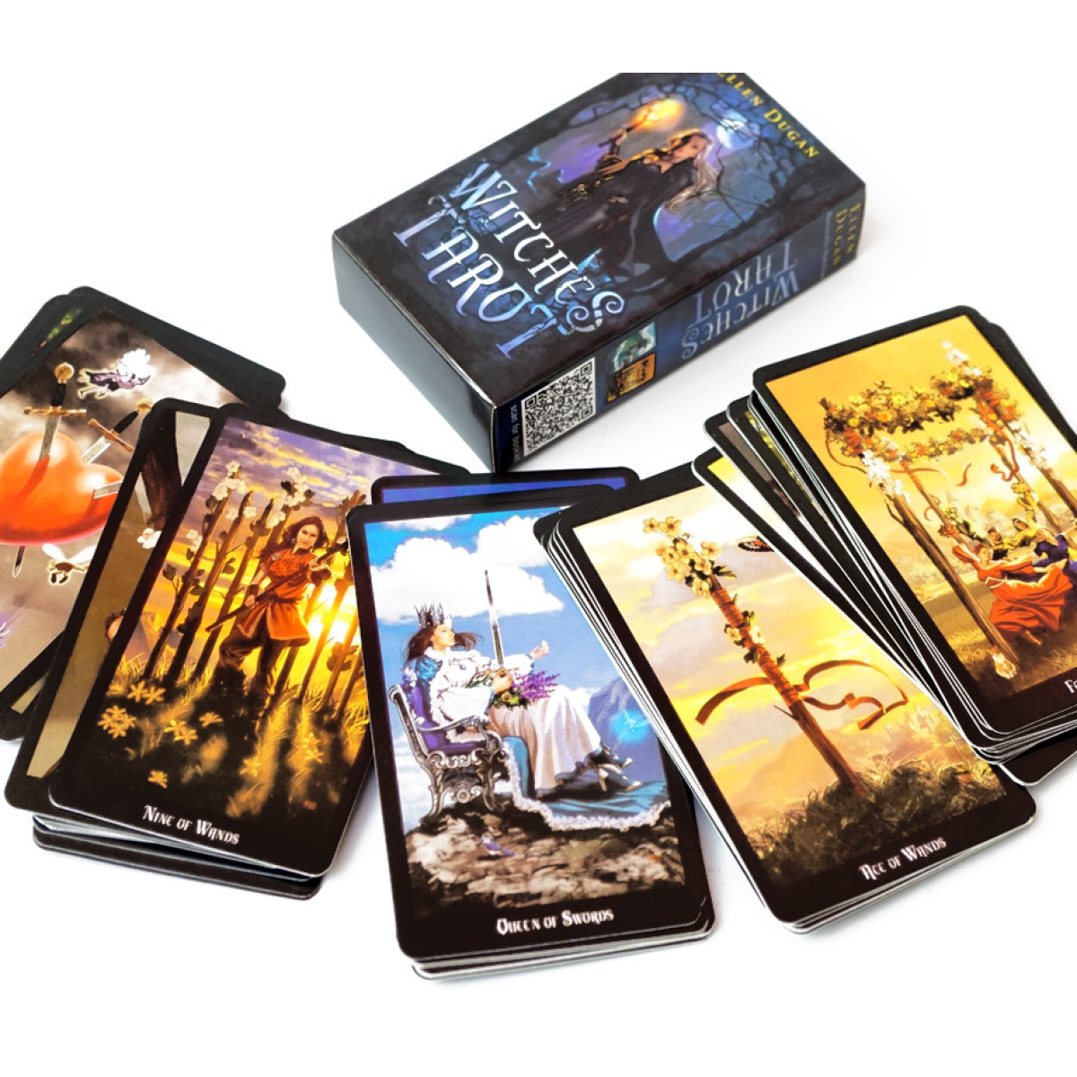 Розмір карти 10,2*6см. Чаклунське Таро Еллен Дуган, занурить вас у дивовижний світ звичних сюжетів Уейта, але з «додаванням магії». Незважаючи на те, що ці карти виконані в класичній системі, автор надала образам нових смислових відтінків, а художник, який працював над створенням ілюстрацій, виконав їх у техніці сучасної комп“ютерної графіки, і від цього складається враження, ніби всі герої сюжетів по-справжньому живі. У порівнянні з більшістю сучасних колод, далеко не завжди придуманих справжніми практиками з великим стажем передбачуваної роботи, чаклунське Таро Дуган значно виграє. Справа в тому, що сама Еллен – не просто таролог, вона практикуюча відьма, екстрасенс, медіум. Звичайно, ремесло автора знайшло відображення всередині створених нею Арканів. Художник, який допоміг задуму Дуган втілитись у реальності – Марк Еванс. Якщо ви заглушите в галерею Колдовського Таро Еллен Дуган (його ж називають Таро Відьм), то побачите, що звичні сюжети мають тут дуже незвичний вигляд: перероблені та додані деякі деталі, істотно відрізняються від класики більш опрацьований задній фон карток, а деякі аркани отримали інші назви, більш властиві саме магічній традиції.Колдове Таро Еллен Дуган Дуда класичне, проте з помітними авторськими нововведеннями. У традиційні, звичні всім шанувальникам Уейта образи гармонійно вплетені різні магічні елементи, тварини, птахи, рослини, міфологічні персонажі — одним словом, деталі, що посилюють класичне значення карти, а часом і суттєво доповнюють її. Декілька Старших Арканів отримали нові назви: так, Колесо Фортуни перетворилося на Колесо Року, Суд став Кармою, а Ієрофант - Первосвящеником. Відразу ж відчувається, що колода просякнута магією і чаклунством, що робить її незамінною для тарологів, які не тільки займаються мантичною роботою, а й проводять різноманітні магічні ритуали.