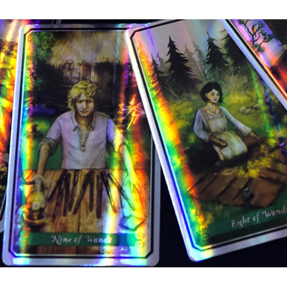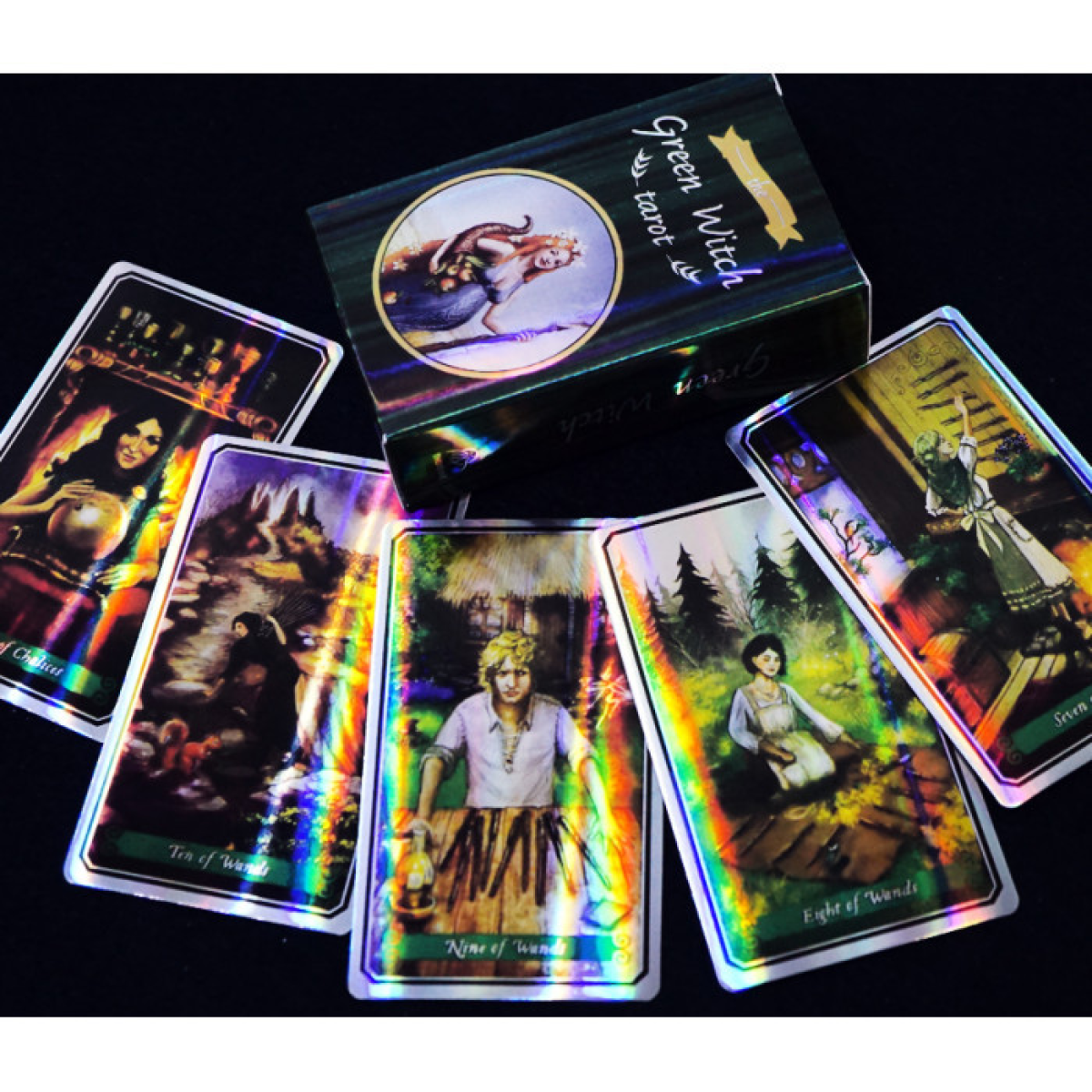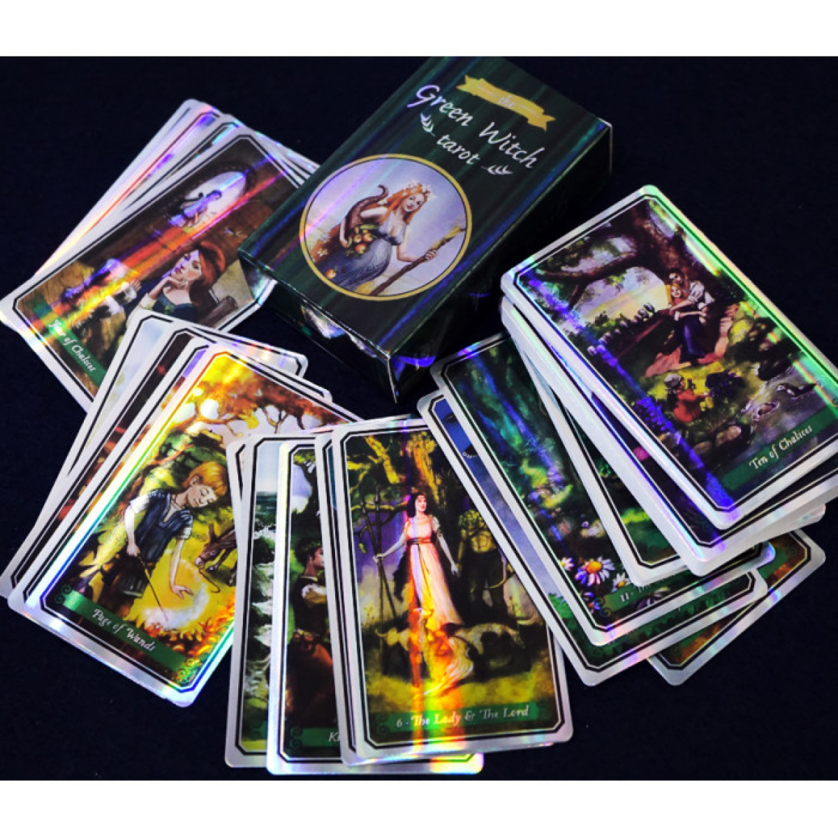 Розмір карти 10*6см. Таро Зеленої Відьми присвячено «зеленому відомству», великому напрямку сучасної магії, що поєднує кельтську магію, травництво, кухонні чари, взаємодія з фейрі (Ші) та інші види чаклунства. Така колода сподобається і послідовникам Віккі, і відьмам, які будують свою практику на взаємодії з природою, і тим, хто бажає глибше осягнути давні язичницькі символи. Барвисті ілюстрації карт наповнені позитивними образами, що несуть натхнення та ідеї для повсякденної магічної практики, а пророцтво за допомогою Таро Зеленої Відьми допоможе вам побачити своє життя у світлі язичницької та природної мудрості, здобути спокій та впевненість на своєму шляху. 78 карт “Таро Зеленої відьми“ - це традиційні Молодші та Старші Аркани. Масти Молодших Арканів є ритуальні вівтарні інструменти: пентакль, атам, жезл і кубок, що символізують енергію стихій (Землі, Повітря, Вогню та Води). Придворні карти Молодших Арканів вказують на тип особистості та характер, а номерні – на подію. На Старших Арканах зображені герої вікканських оповідей, що символізують вас чи вашу ситуацію. На кожній карті художник зобразив безліч деталей (одні видно відразу, інші доведеться пошукати): це можуть бути знаки зодіаку, трави, комахи, птахи, тварини, вказівки на пори року. У поєднанні символів та образів криються різні інтерпретації, задумані автором та художником. Спробуйте розгадати їх і ви будете здивовані, наскільки точно (і по-різному, залежно від ситуації) розкриваються перед вами карти, а значить, і ваше розуміння того, що відбувається. Зелена відьма з радістю поділиться своєю мудрістю, варто лише поставити їй запитання