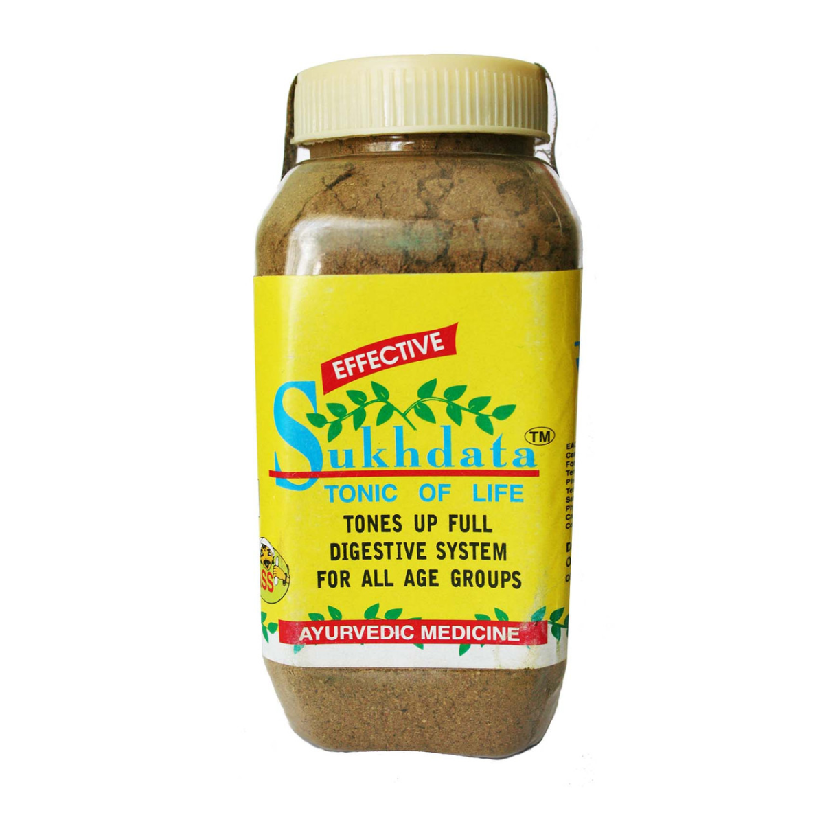 Дія: Сукхдата знімає запалення у шлунку, покращує та відновлює кишкову флору, допомагає відновитися після хронічної діареї, дизентерії, ентериту та застосування антибіотиків. При тривалому застосуванні нормалізує роботу товстого кишечника та позбавляє від хронічних запорів. Чинить антипаразитну дію, Сприяє зниженню ваги є чудовим мозковим тоніком. Сукгдата чурна - енергетичний тонік який впливає на роботу шлунково-кишкового тракту, можна застосовувати навіть дітям, і має сильну антипаразитарну дію. Сукхдат живить клітини кори головного мозку, допомагає при розумових навантаженнях. Вона знімає напругу в слизовій оболонці шлунка і дванадцятипалої. Сукхдата чурна допомагає при надмірній вазі та підвищеному вмісті холестерину в крові. Склад Сукхдата чорна: в 5г препарату містять Cassia angustifilia 1.2r, Foenialum vulgare 100mg, Terminalia chebula 500mg, Pinus roxburghil 100mg, Terminalia belerica 500mg, Santaum album 1r, Philumtus emb. Показання: Сукхдата знімає запалення у шлунку, покращує та відновлює кишкову флору, допомагає відновитися після хронічної діареї, дизентерії, ентериту та застосування антибіотиків. При тривалому застосуванні нормалізує роботу товстого кишечника та позбавляє хронічних запорів. Сприяє зниженню ваги і є чудовим мозковим тоніком.Прибирає паразитарні інвазії, регулює порушення роботи шлунково-кишкового тракту, усуває дисбактеріоз кишечника, допомагає при гастриті зі зниженою кислотністю, при підвищеному холестерині, ожирінні, висипаннях на шкірі, хороший збалансований омолоджуючий засіб. Застосування: 2 ч. л. на ніч перший день, дорослим – 1/2 ч.л. 2 рази на день до їди або 1 ч.л. перед їжею (поступово можна зменшувати дозування до 1 ложки 1 раз на 3 дні); дітям віком до 6 років 1/4 ч.л. перед сном; дітям від 6 до 14 років – 1/2ч.л. перед сном. Загальний курс застосування препарату не перевищує 3 місяці.
