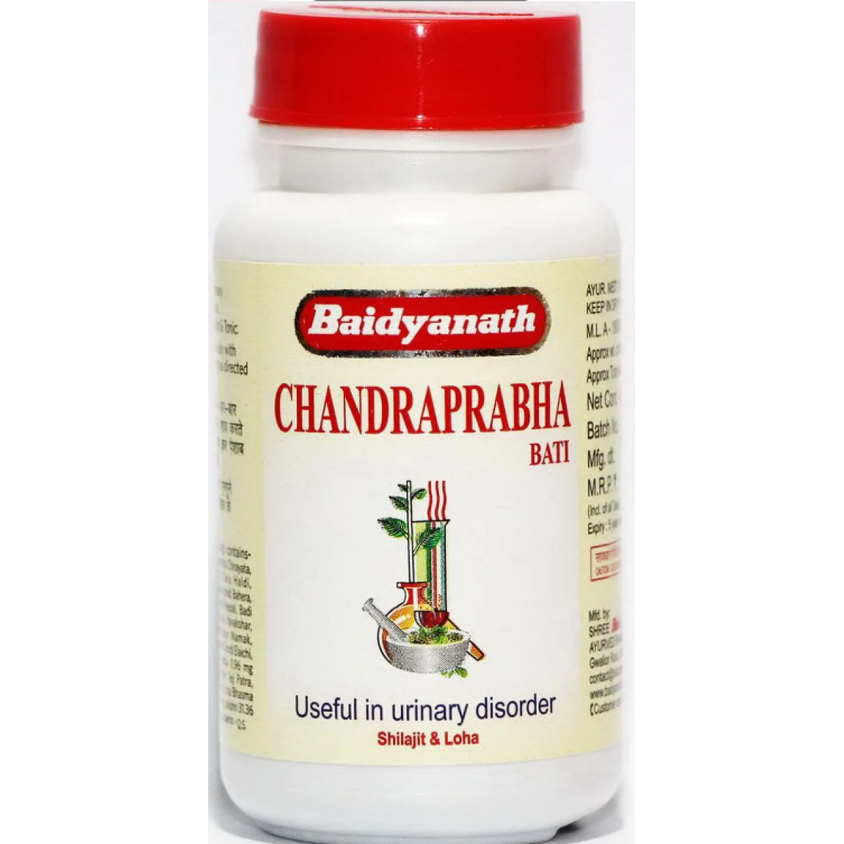 Ефективний сечостатевий тонікс Капуркачарі, Вача, Шуддха Шіладжату, Гуггулу та іншими сильнодіючими інгредієнтами, які роблять його особливо корисним для лікування дизурії, почастішання сечовипускання, загальної слабкості та білі. Лікувальні дії: ефективно заряджає енергією та пожвавлює систему завдяки своїм антивіковим властивостям ефективно балансує вату, пітту та капху очищує організм від токсинів завдяки дії ротовішодхани є ефективним поглиначем вільних радикалів має природні властивості афродизіаку покращує анемію має значну протизапальну активністю покращує обмін речовин та загальне самопочуття балансує рівень цукру у крові покращує фертильність у жінок. Показання для застосування: гонорея каміння у нирках вульвіт лихоманка печіння при сечовипусканні білі та гінекологічні проблеми енурез (нетримання сечі) поліурія, інфекція сечовивідних шляхів, нетримання сечі, дизурія зниження сили, витривалості та імунітету слабкість насіннєвої рідини, передчасне сім“явипорскування, еректильна дисфункція анемія, загальна слабкість та одужання запальні та алергічні прояви шкіри як допоміжний засіб при: цукровому діабету, ДГПЗ (бенінської гіперплазії передміхурової залози), жіночому безплідді, артриті, ішіасі та слабкості нервів. Побічні дії: Чандрапрабха Баті Байдьянатх не має жодних побічних ефектів, якщо приймати її відповідно до запропонованої дозування. Спосіб застосування: По 1-3 таблетки двічі на день запиваючи молоком або по вказівкою лікаря. Аюрведичні препарати працюють цілісно, вони мають накопичувальною властивістю, яка досягається в результаті їх прийому протягом 3-х і більше тижнів, іноді курс лікування може тривати 6 та більше місяців. Тривалість лікування та початок дії препарату залежить від різних факторів, таких як тяжкість і симптоми захворювання, вік, фізичне та психологічний стан пацієнта тощо. Результати можуть варіюватися від людини до людини. Для отримання додаткової інформації зверніться до вашого аюрведичного лікаря. Спосіб зберігання: Зберігати в сухому, прохолодному місці, далеко від прямих сонячних променів. Не заморожувати.